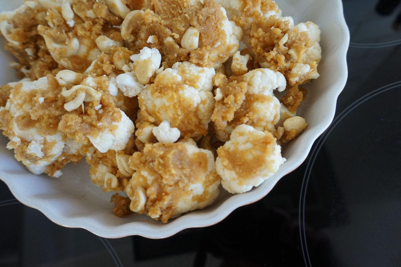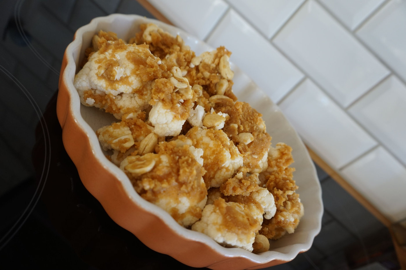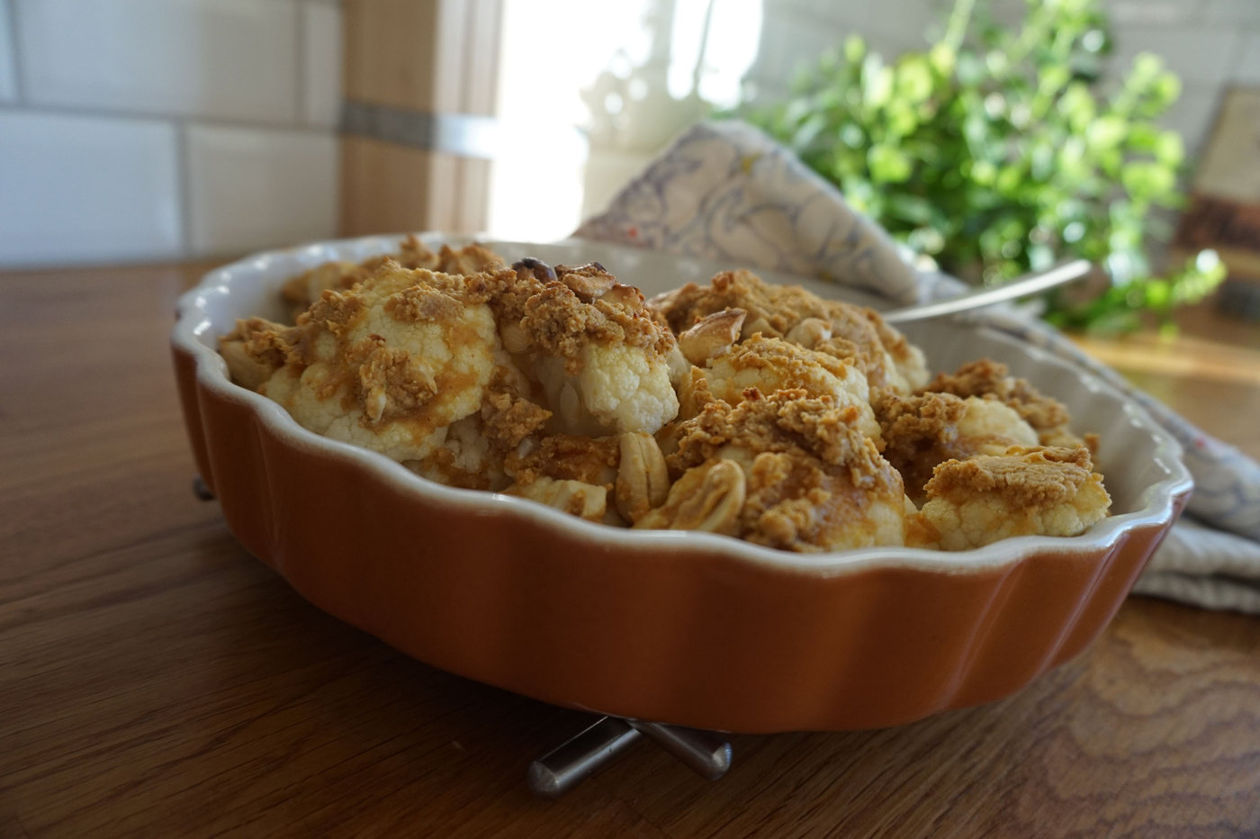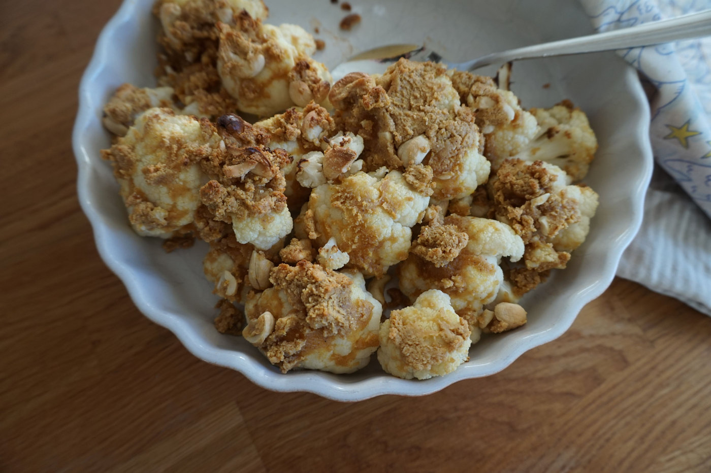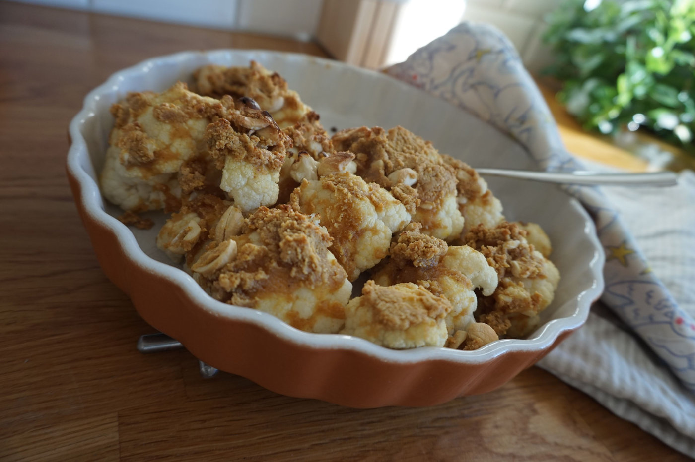 En tjej som alltid inspirerar med sina bakverk och matlagning är Fanny. För ett tag sedan läste jag om hennes ugnsgratinerade blomkål och eftersom jag tyckte att det verkade så gott lagade jag detta tillbehör till gårdagens middag. Och ja, gott var det! Och det var kul med ett litet annorlunda tillbehör. Att smaksätta grönsaker med jordnöt och curry är inget jag gör så ofta annars.