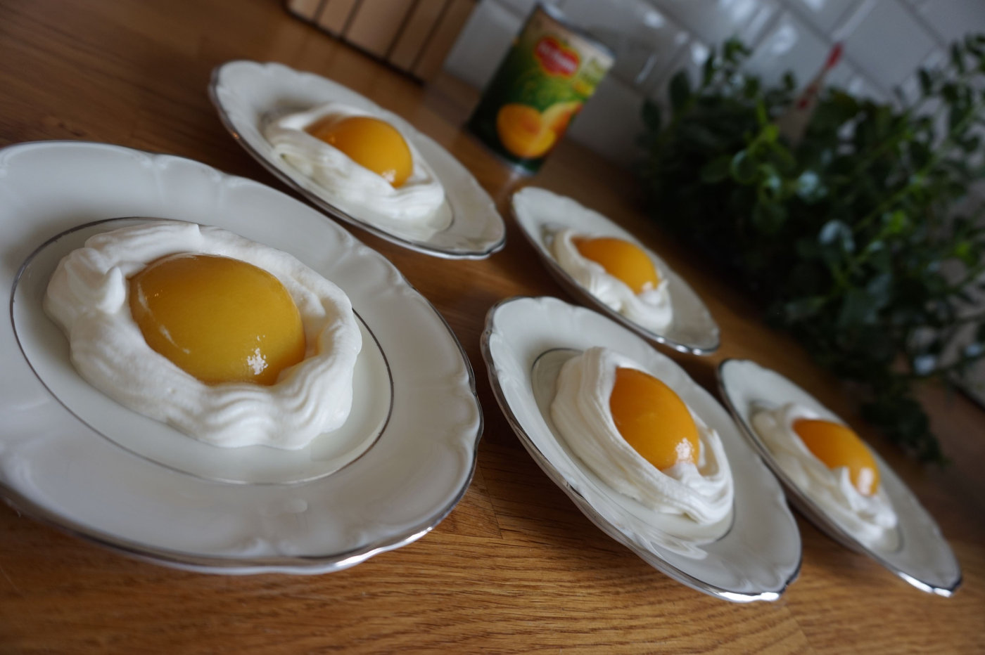 Igår hade vi svärföräldrarna här på besök och vi åt en härlig påskbuffé tillsammans. Till efterrätt gjorde jag något som gick hur snabbt som helst att göra och som passar bra nu till påsk. Det såg ut som stekta ägg, men bestod av en halv persika och lite spritsad vispgrädde.