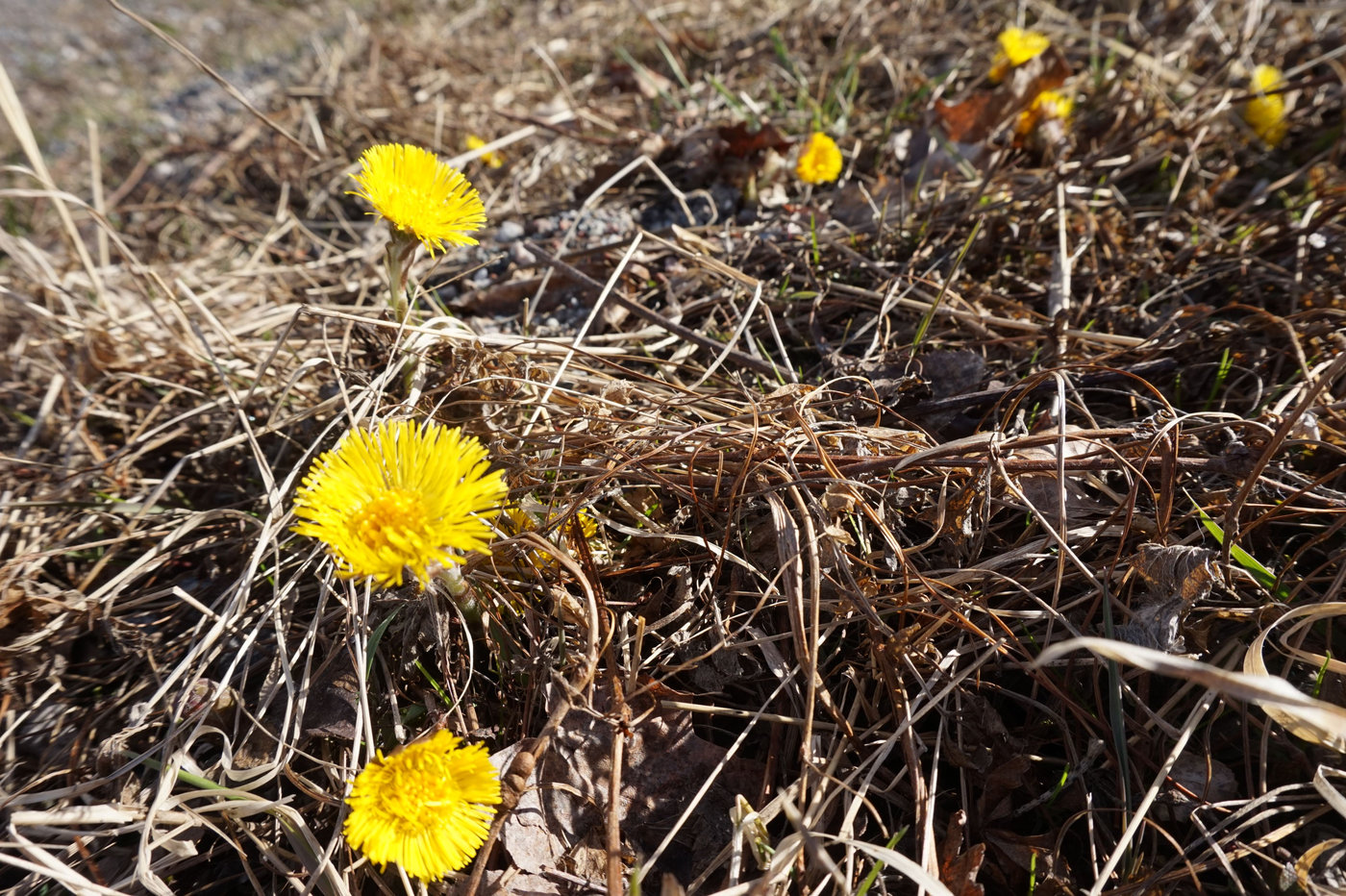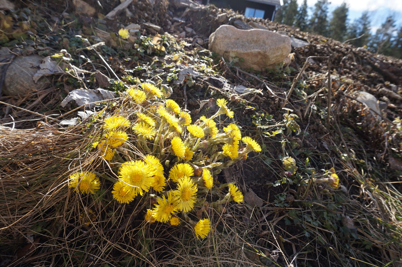 Alla små gula tussilagos gillar visst också solen. Jag riktigt kunde se hur de sträckte sig mot den där de lyste i sina diken.