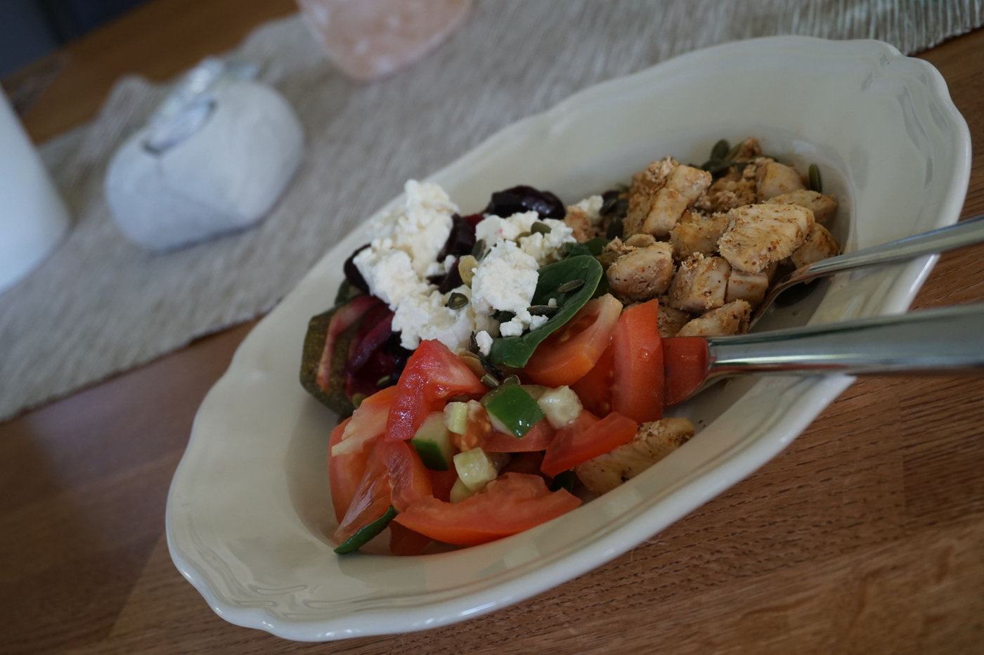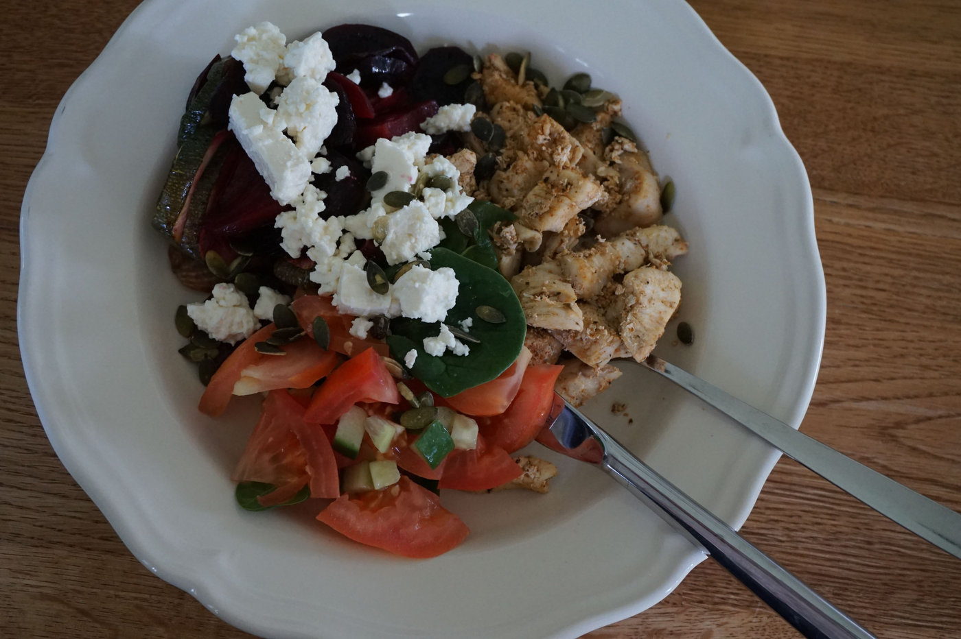 kycklingmiddag (3)Gårdagens middag med både ugnsrostade rotfrukter och grönsaker till kycklingen. Älskar kombinationen rödbetor och fetaost!