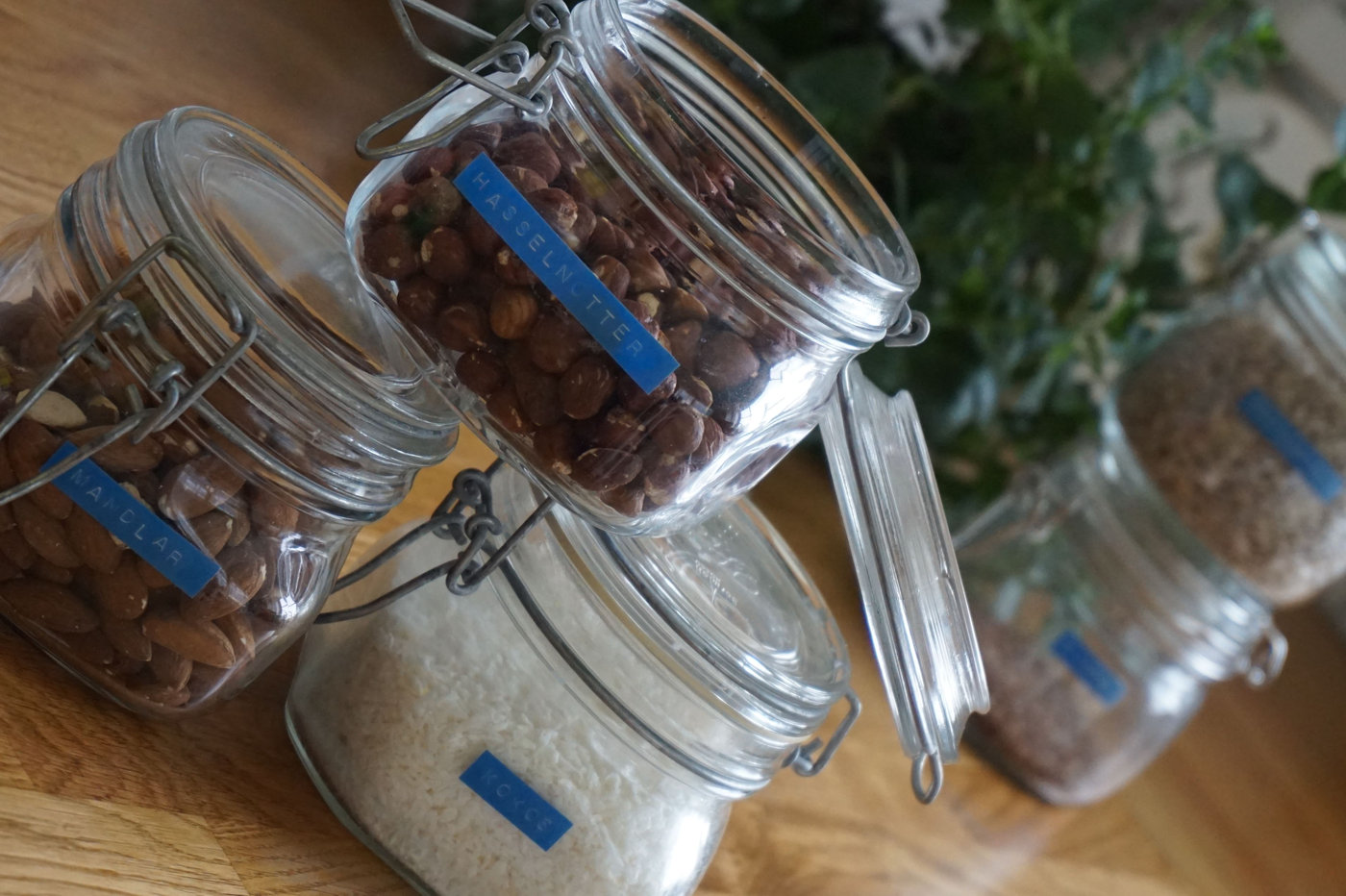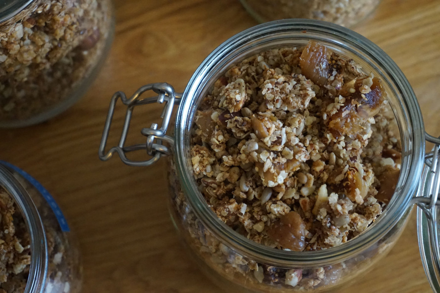 Låt gärna plåtarna stå kvar i ugnen på eftervärmen eftersom det gör granolan mer knaprig. När du har tagit ut plåtarna och granolan har svalnat skär du torkad fikon i små bitar och blandar med det andra. Lägg granolan i fina burkar.
