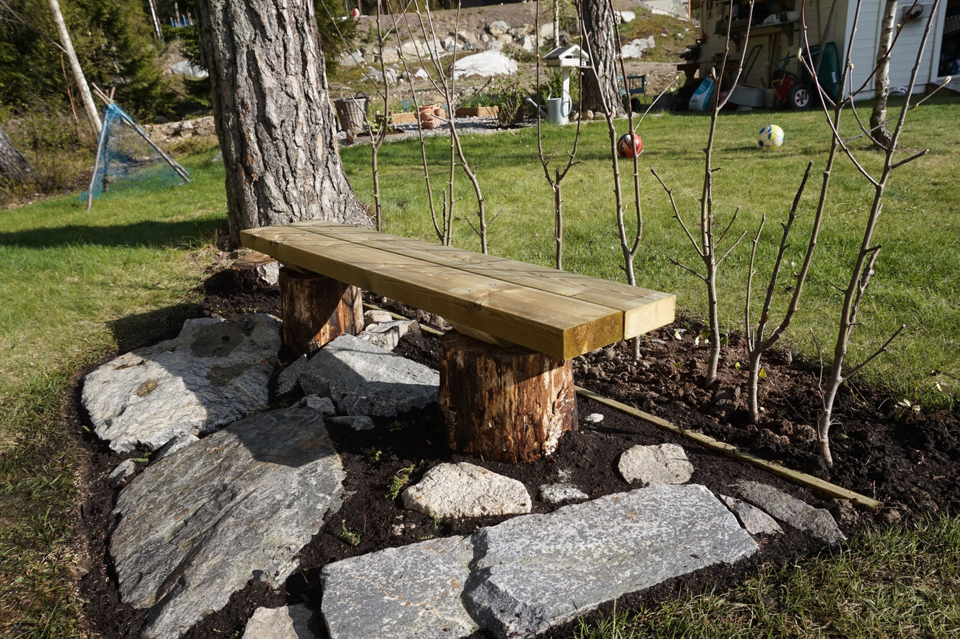 Medan jag höll till i odlingslandet gjorde mannen en stenanläggning, plantering samt bänk att sitta på vid vår badtunna. Där blir det perfekt att kunna hänga i samband med att vi tar ett bad!