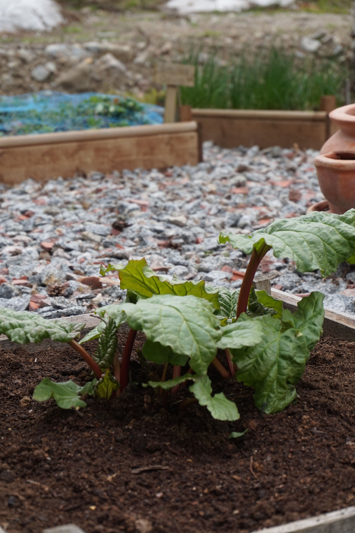 Rabarbern har redan kommit långt och snart kan vi nog göra årets första rabarberpaj. Bakom rabarbern syns en massa gräslök, som redan har kommit upp riktigt mycket.