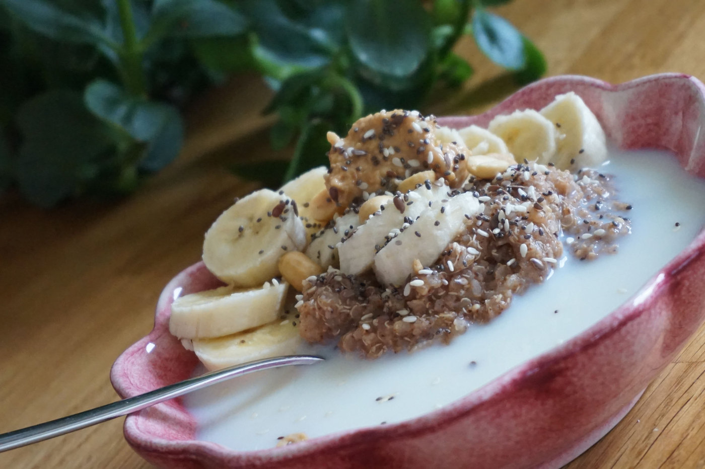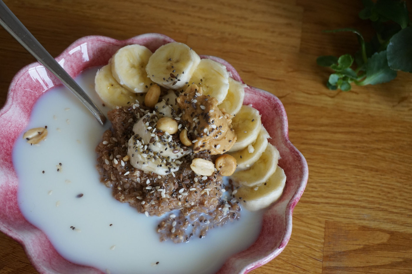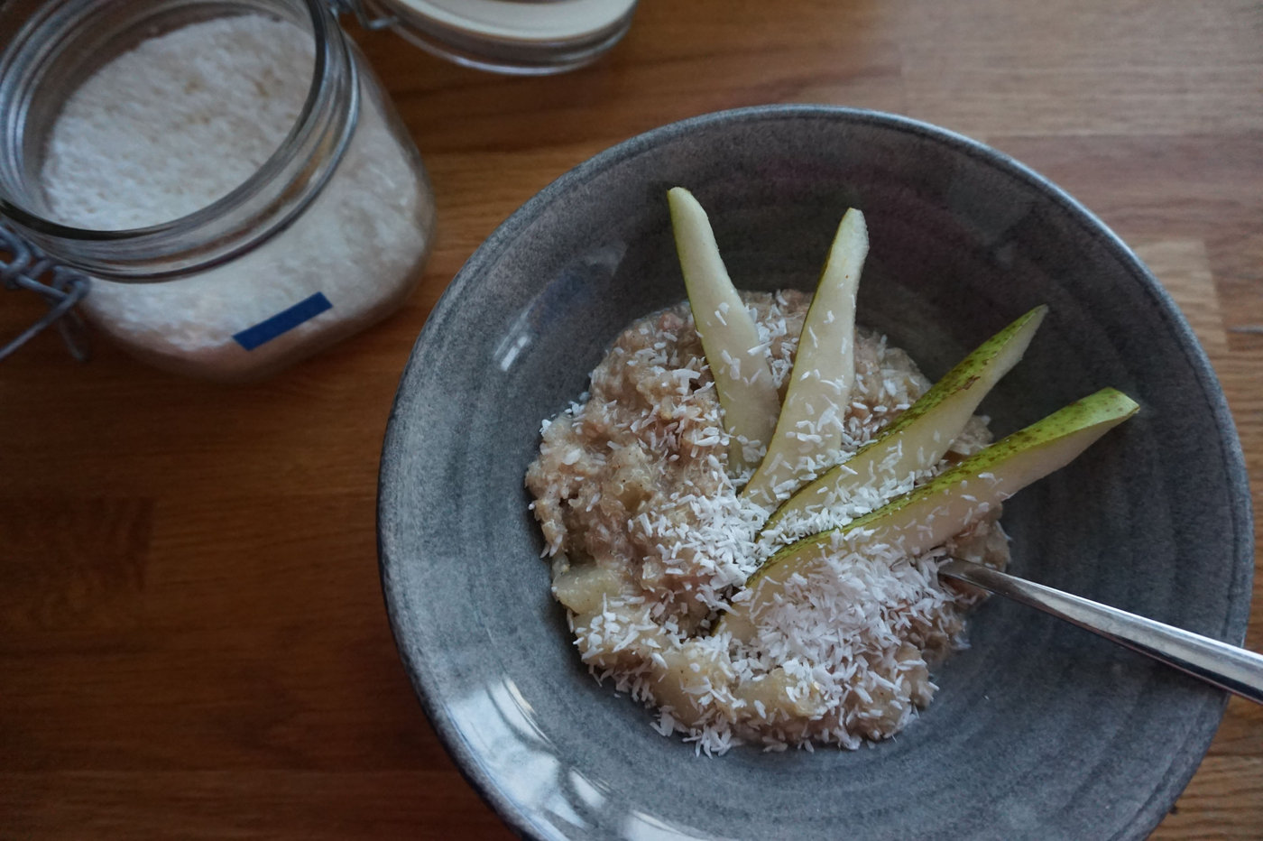 Som sagt, frukosten är en del av det där guldiga i munden. I morse blev det quinoagröt med kanel, kardemumma, banan och jordnötssmör. En annan god variant på quinoagrröt är den ovan med päron och kokos.