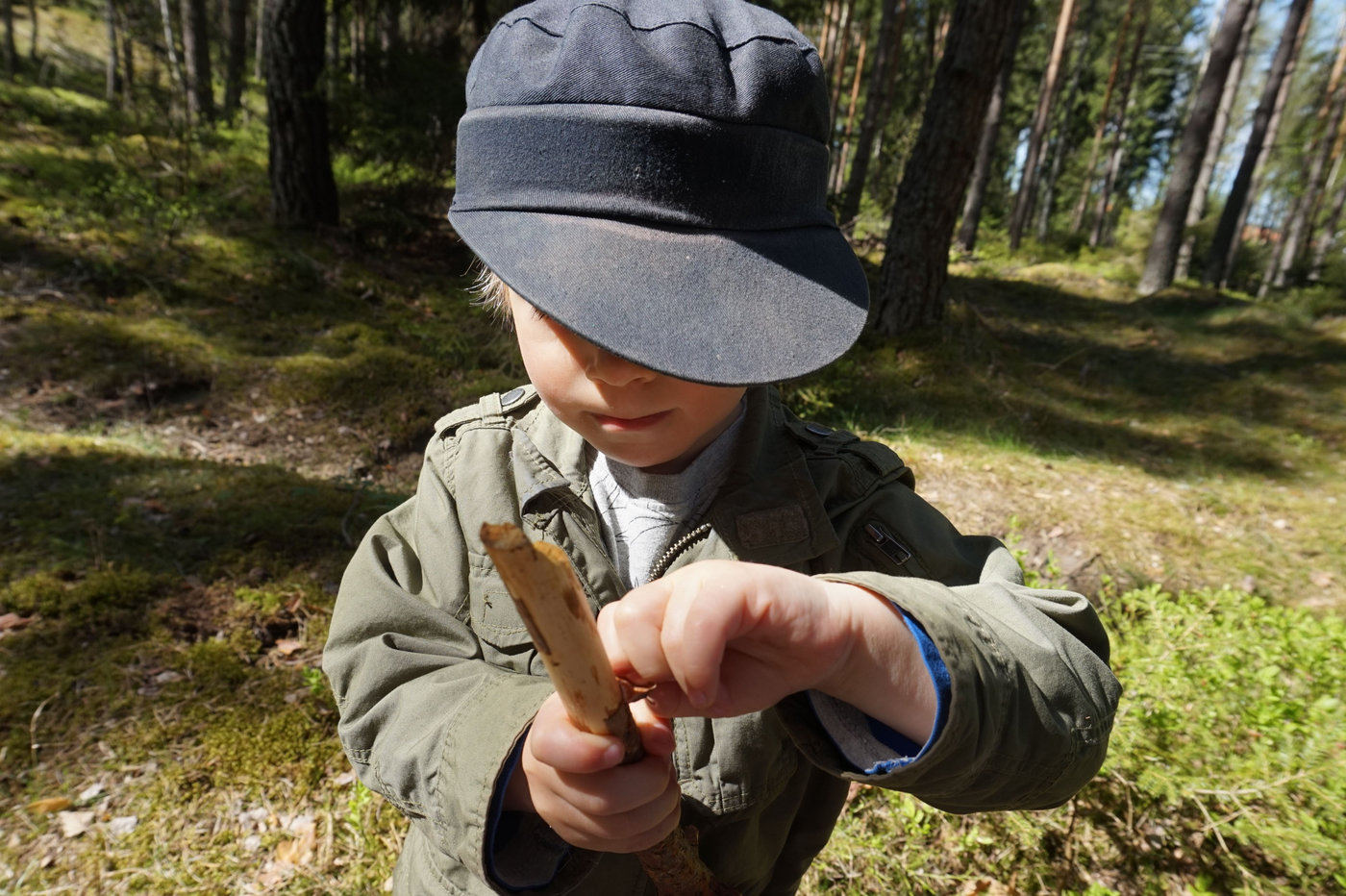 Solen sken och det var riktigt varmt. Fastän vi var inne i den skuggande skogen var det ingen av oss som frös och när solen sken genom träden var det så fint som det bara kan bli i en barrskog när solen skiner. Vi tittade på vitsippor, blåbärsris och alla spännande stigar som ledde åt olika håll.