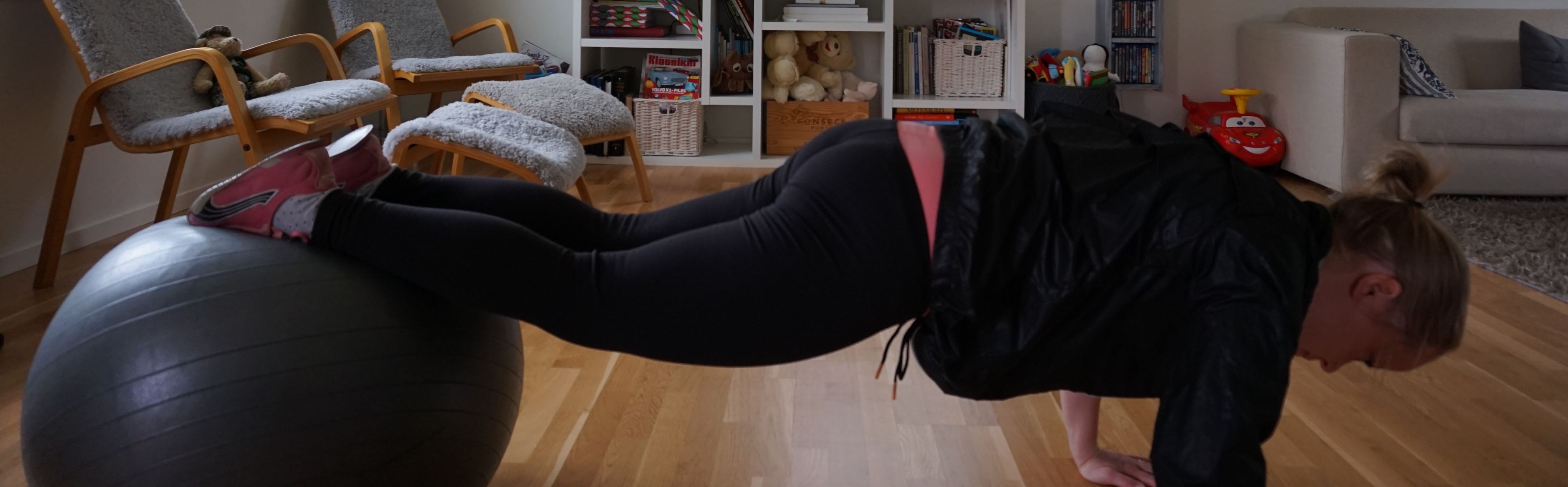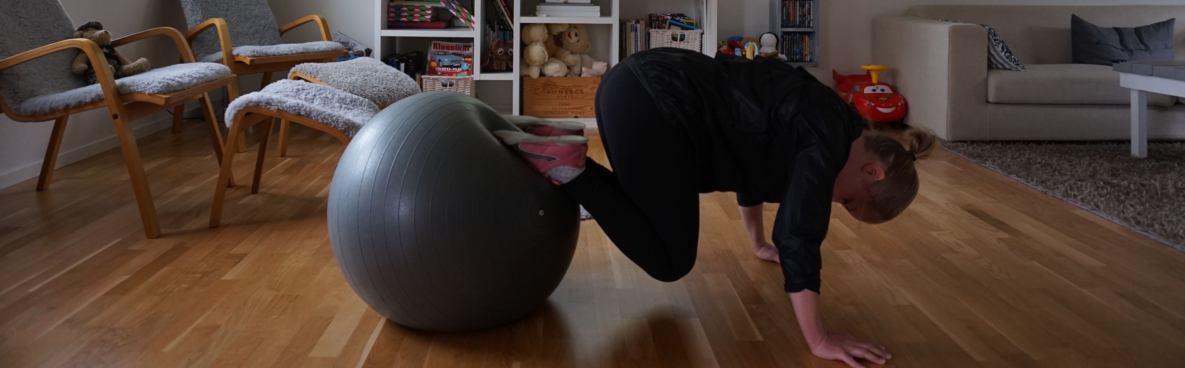 Armhävningar: Sätt händerna på bollen och håll rak kropp i övrigt. Spänn till coren och sjunk ner i en armhävning genom att böja på armbågarna. Spänn och aktivera för att behålla balansen och fortsätt så många repetitioner samt set som du orkar.