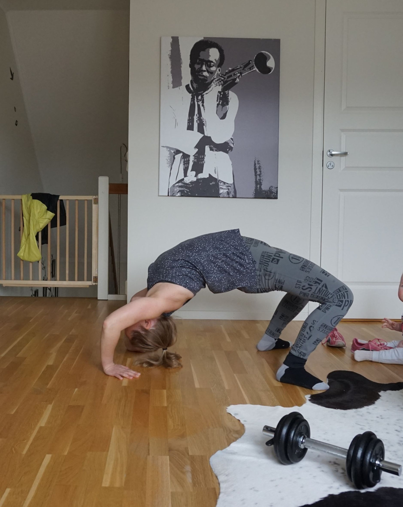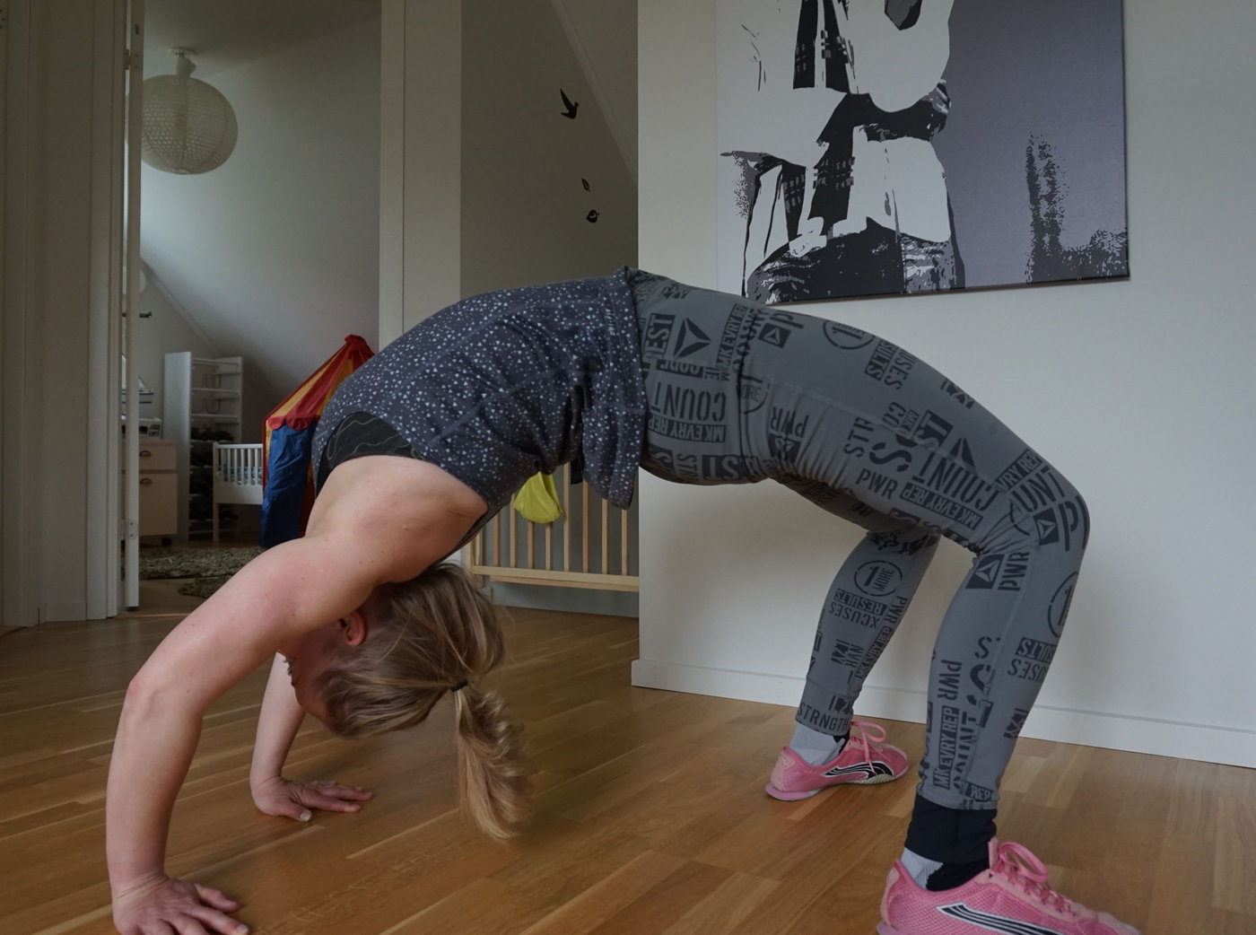 Jag jobbade med olika triset och ett superset och använde mig av hantlar, viktplattor och den egna kroppsvikten. Kan säga att det var triset nummer tre när jag bara jobbade med kroppen som var det jobbigaste. Det och sista övningen; backbend när jag även försökte mig på att böja armbågarna i en slags armhävning när jag stod där. Tungt, men kul!