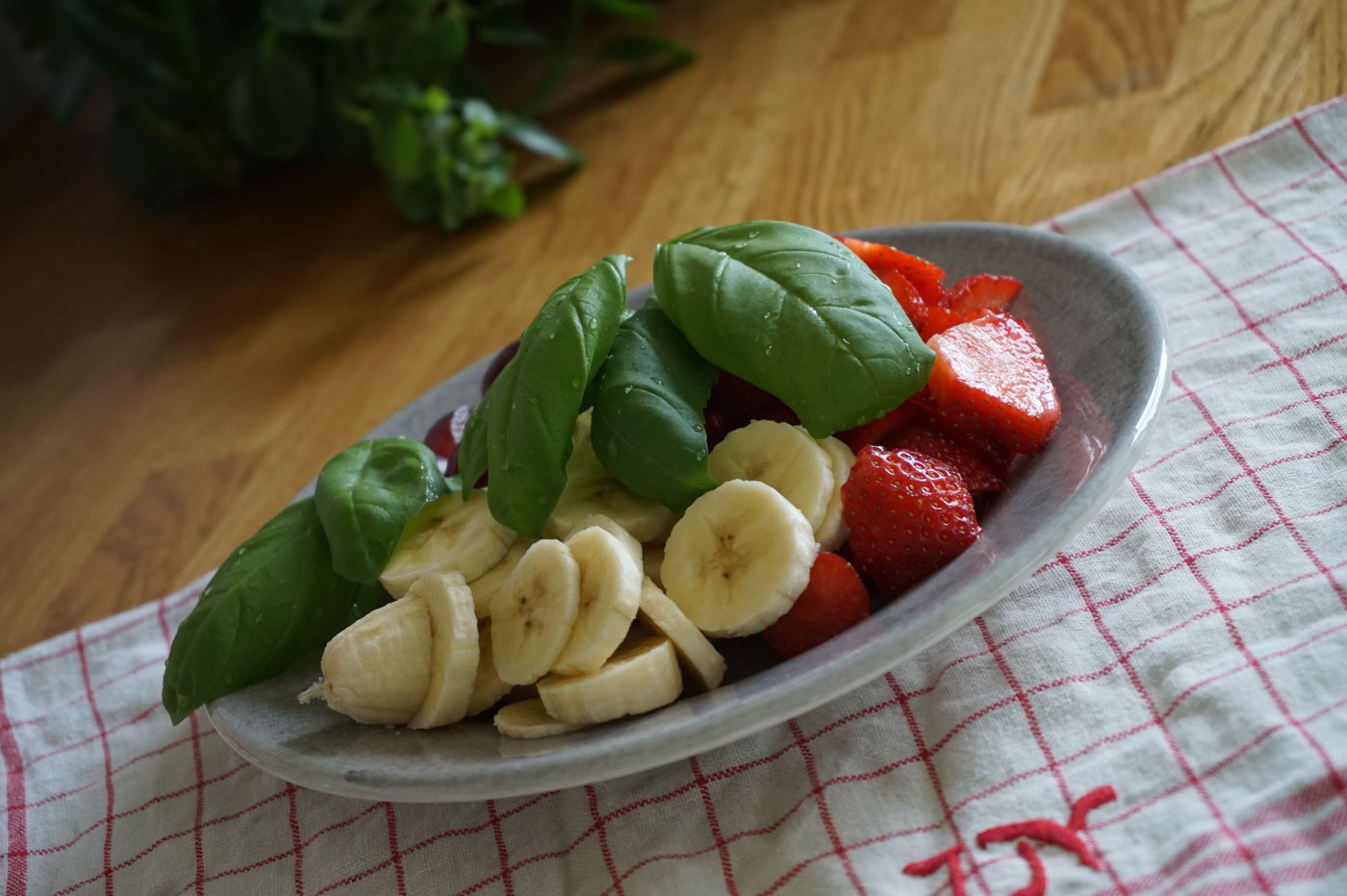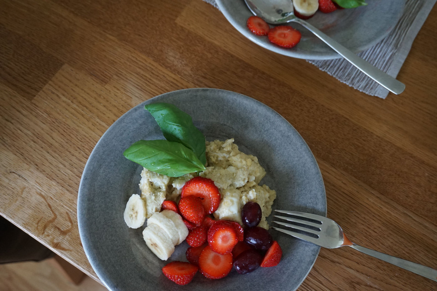 För att kompensera för hotellfrukosten gjorde jag igår en riktig lyxfrukost här hemma istället. Jag skar banan, vindruvor och jordgubbar i bitar och lade upp på ett fat. Färska frukter går hem hos alla i familjen så ett smart sätt att se till att alla får i sig av det är just att duka fram ett sådant fat på frukostbordet.
