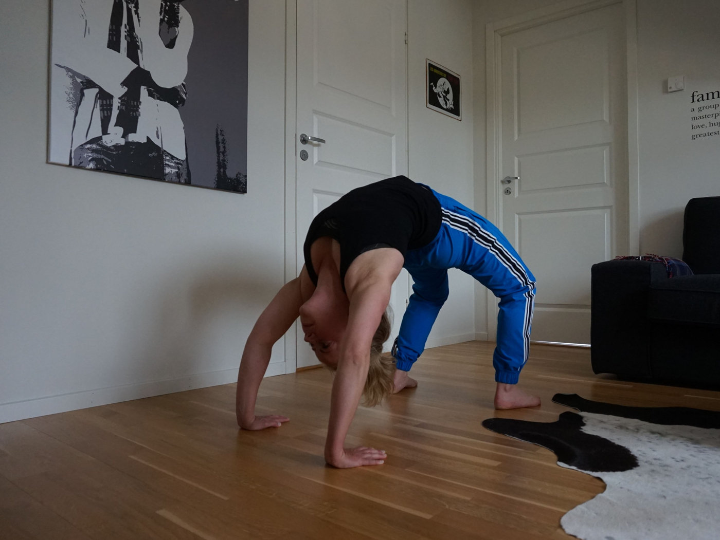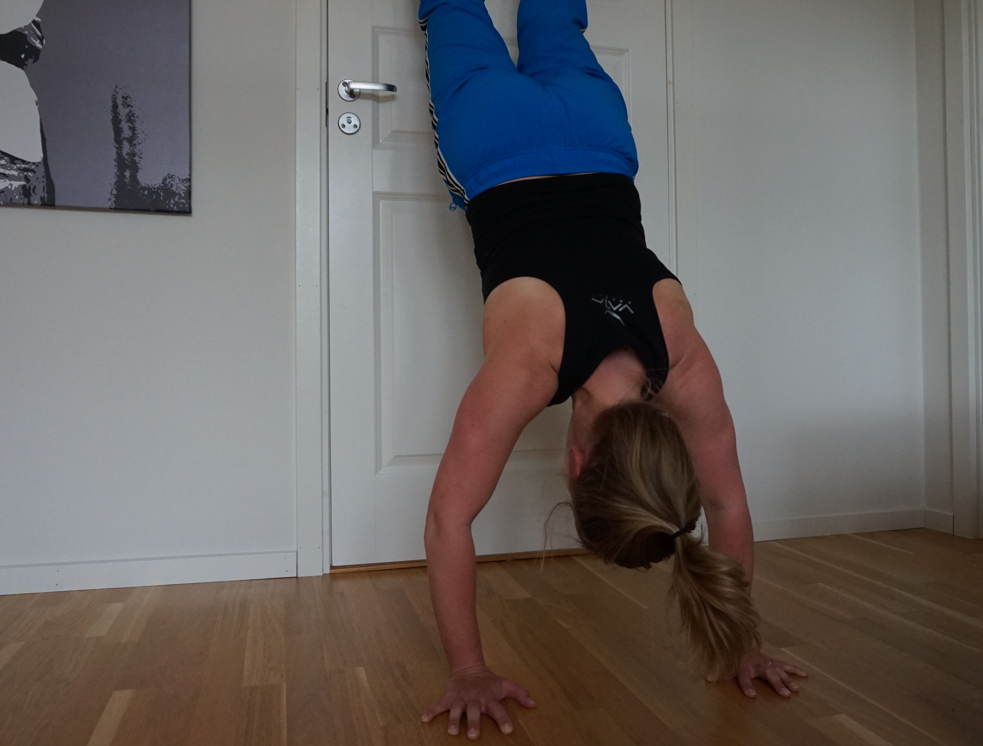 När jag kom hem efter att ha sprungit ett gäng backintervaller var jag sugen på att testa lite handstående. Har gjort det förut, men inte lyckats ta mig upp mot en vägg. Förstår inte varför det ska vara så svårt?!!