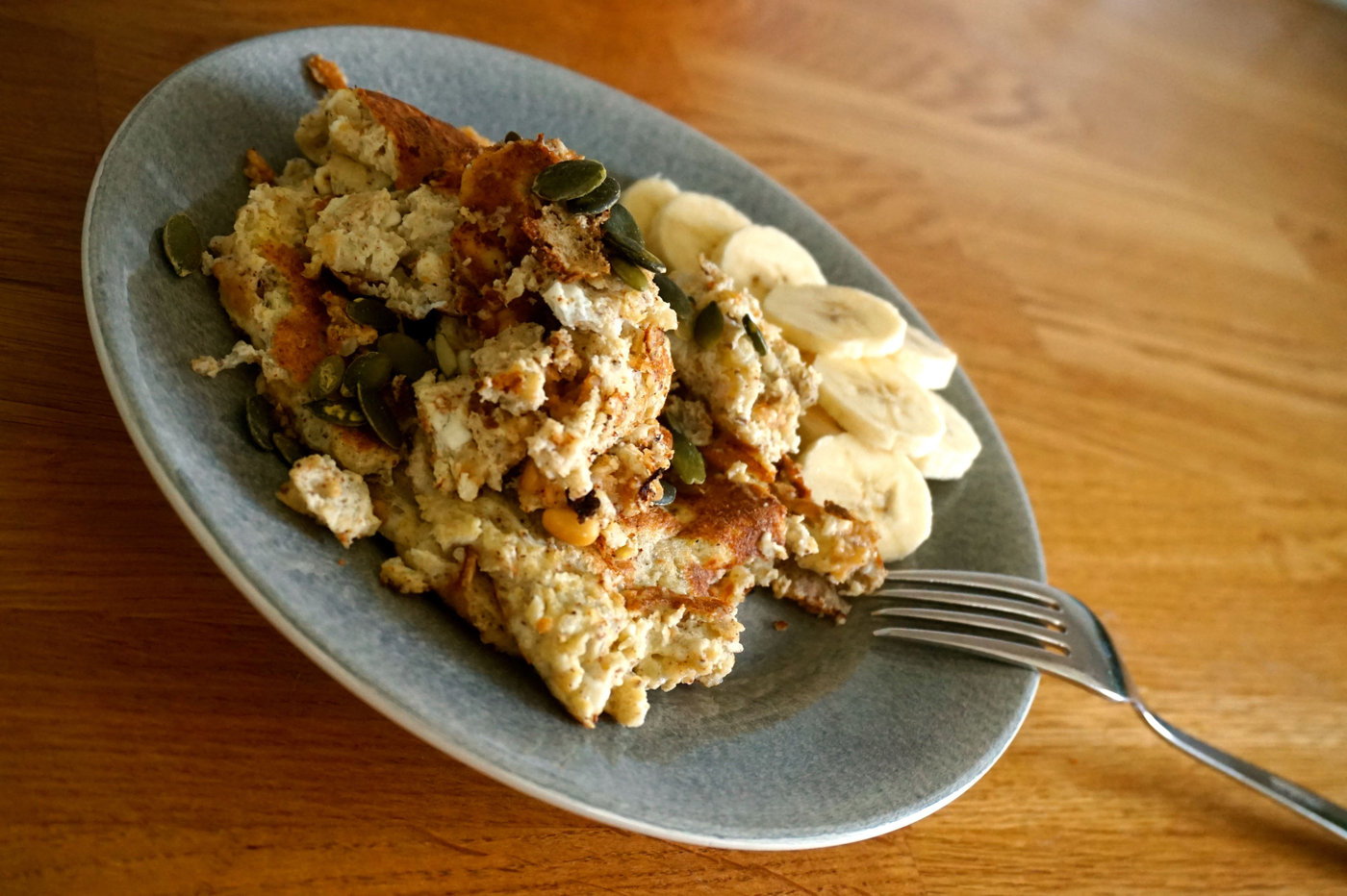 När jag kom in från träningen var jag desto hungrigare än innan och jag var grymt sugen på bananpannkaka så det fick det bli. Jag mosade en halv banan tillsamman med en sked jordnötssmör, tre ägg och en klick keso. Stekte smeten till en pannkaka och åt den tillsammans med resten av bananen och pumpafrön. Trasig blev den, men god var den!
