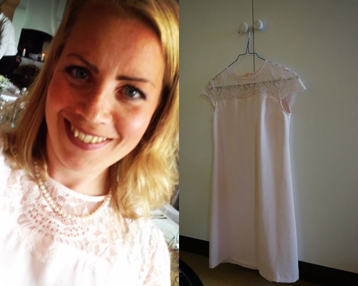 Min klänning för kvällen var ny och kändes perfekt att ha på ett sommarbröllop. Ljust rosa och mes spets. Det som var mindre bra var att de repades upp i tyget redan vid första användningen…