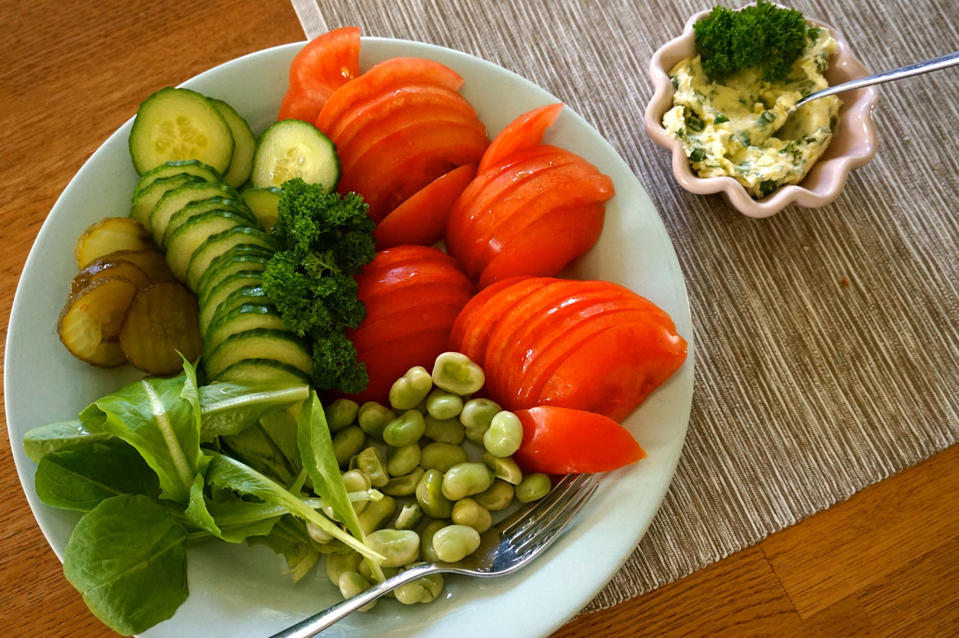Till lunch grillade vi kött, kokade färskpotatis och åt med grönsaker och egengjort ört- och vitlökssmör. Gott!