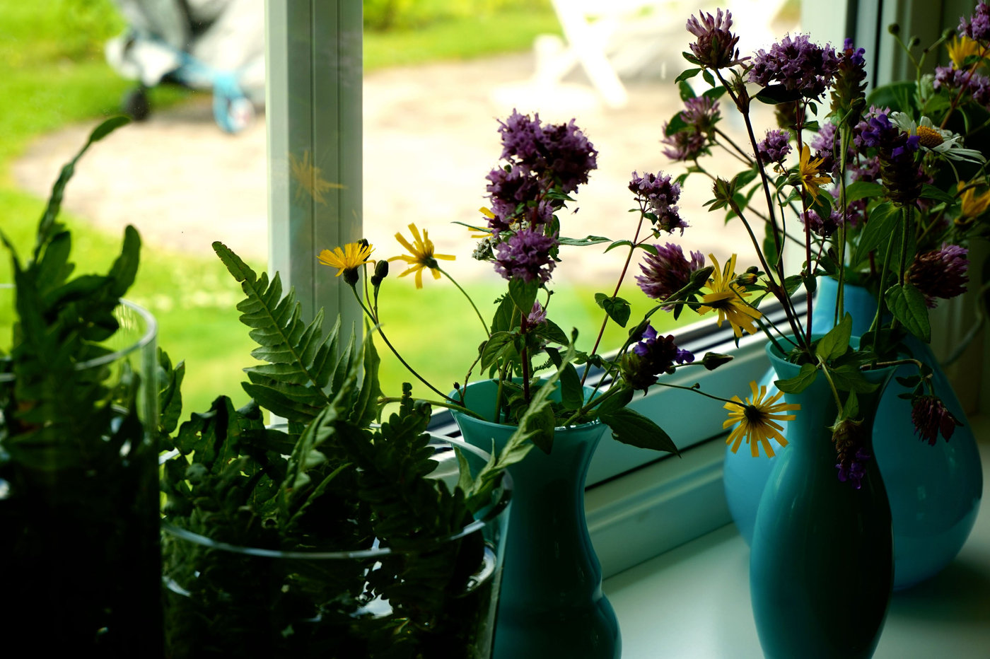 Jag fyllde även två cylindervaser i glas med ormbunksblad. Även det är sommar för mig och sådant som gör mig lite extra glad.