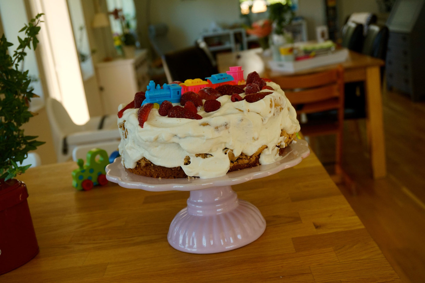 När vår lilla prinsessa fyllde år bakade jag en tårta, som verkligen kändes somrigare än somrigast. En typisk midsommartårta, sommarkalastårta eller för en lyxig fika i syrenbersån. I receptet står att man ska ha Rice Krispies i marängbottnarna, vilket jag hade. Men istället för att ge krisp och crunch blev de snarare som små hårda bollar och så här i efterhand hade jag skippat dem. Om du ska baka denna tårta tycker jag att du struntar i dem och gör en klassisk maräng på socker och äggvita istället.