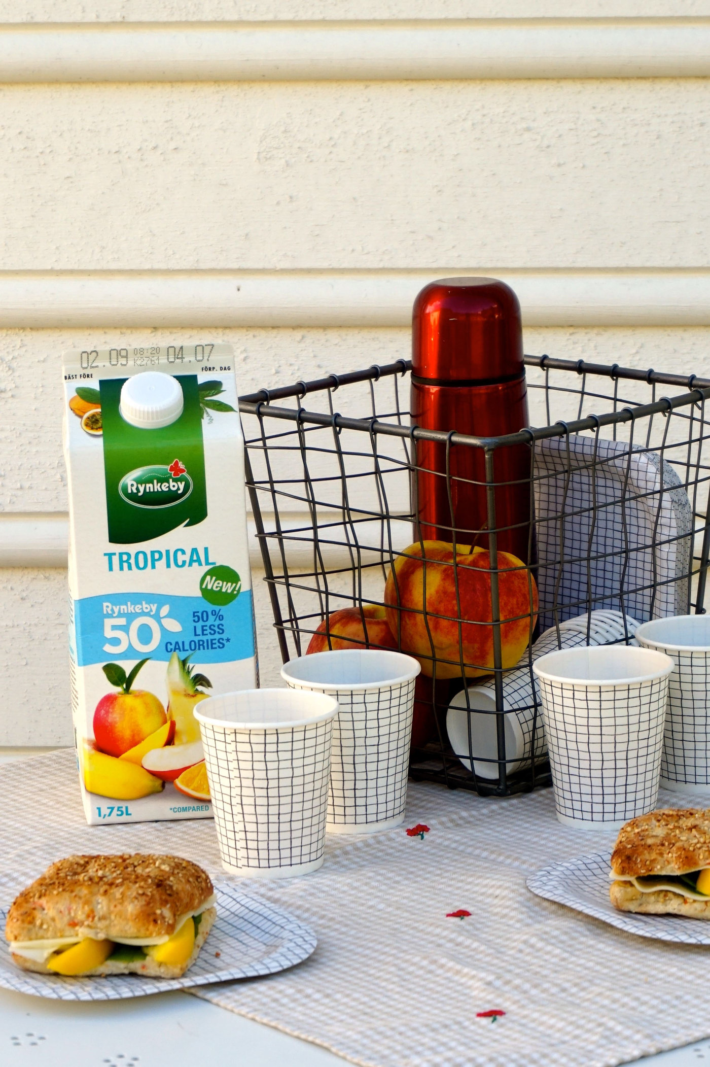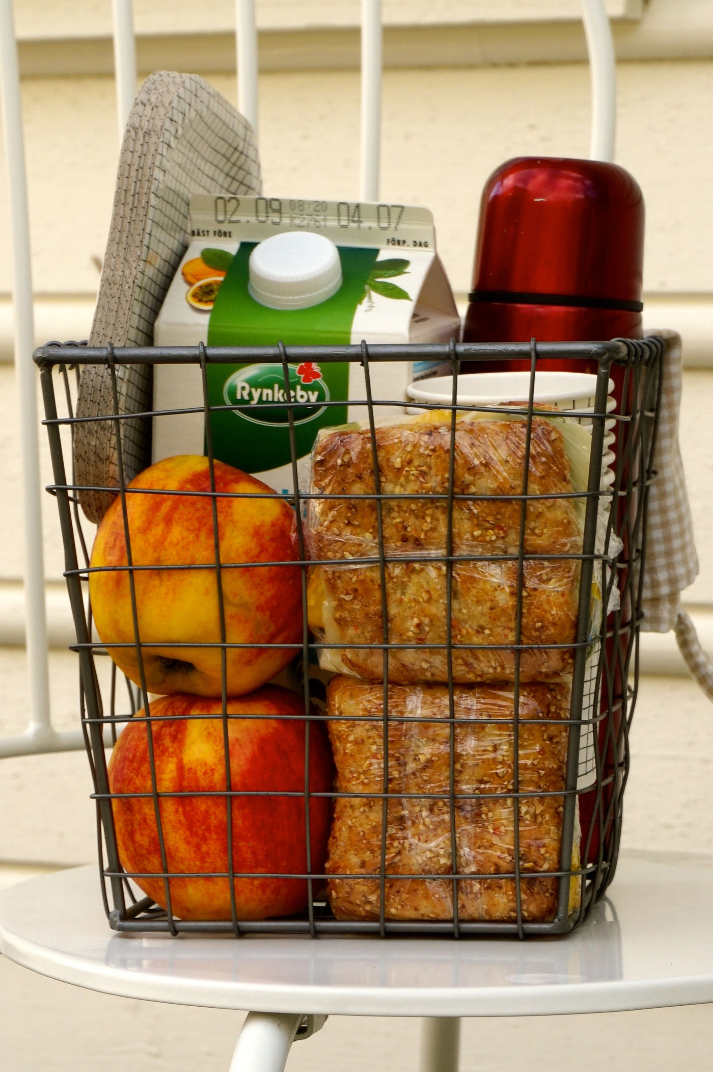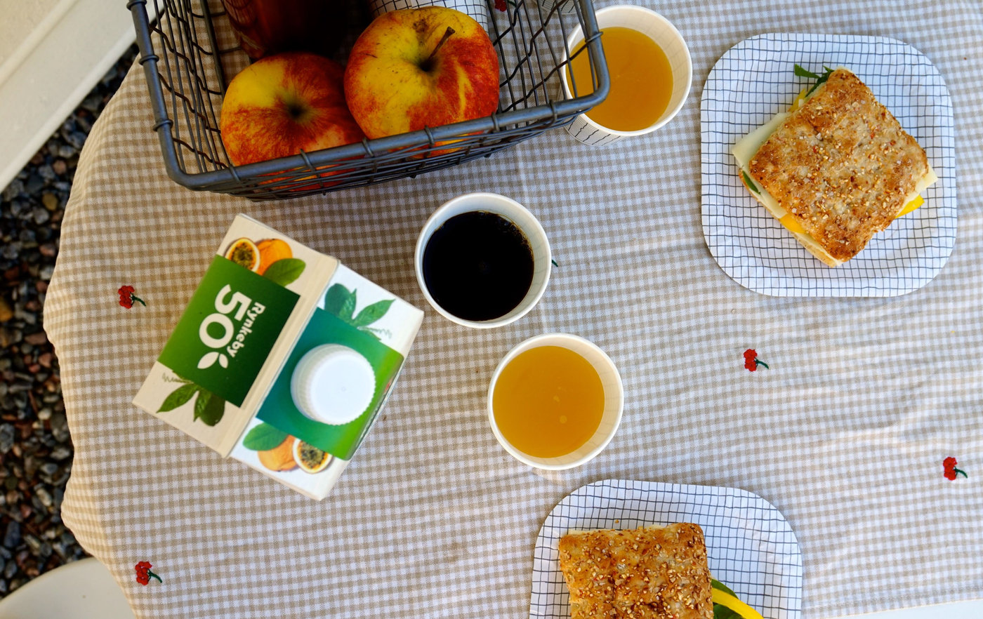 I frukostkorgen har vi kaffetermos och nektar. Vi har den från Rynkeby som är sötad med stevia och har smak av tropiska frukter. Den passar bäst till frukostmat. Vi har varsin rejäl smörgås med ost och grönsaker. Och så har vi någon frukt, som äpple till exempel.