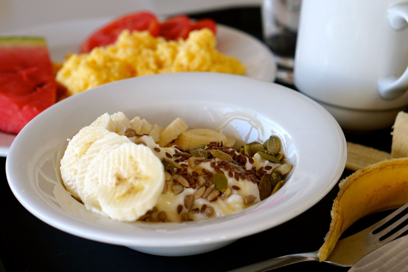 Eller så tog jag en skål med naturell yoghurt, banan, melon, fröer och en skvätt honung. Till det ägg i någon form samt kaffe och vatten.