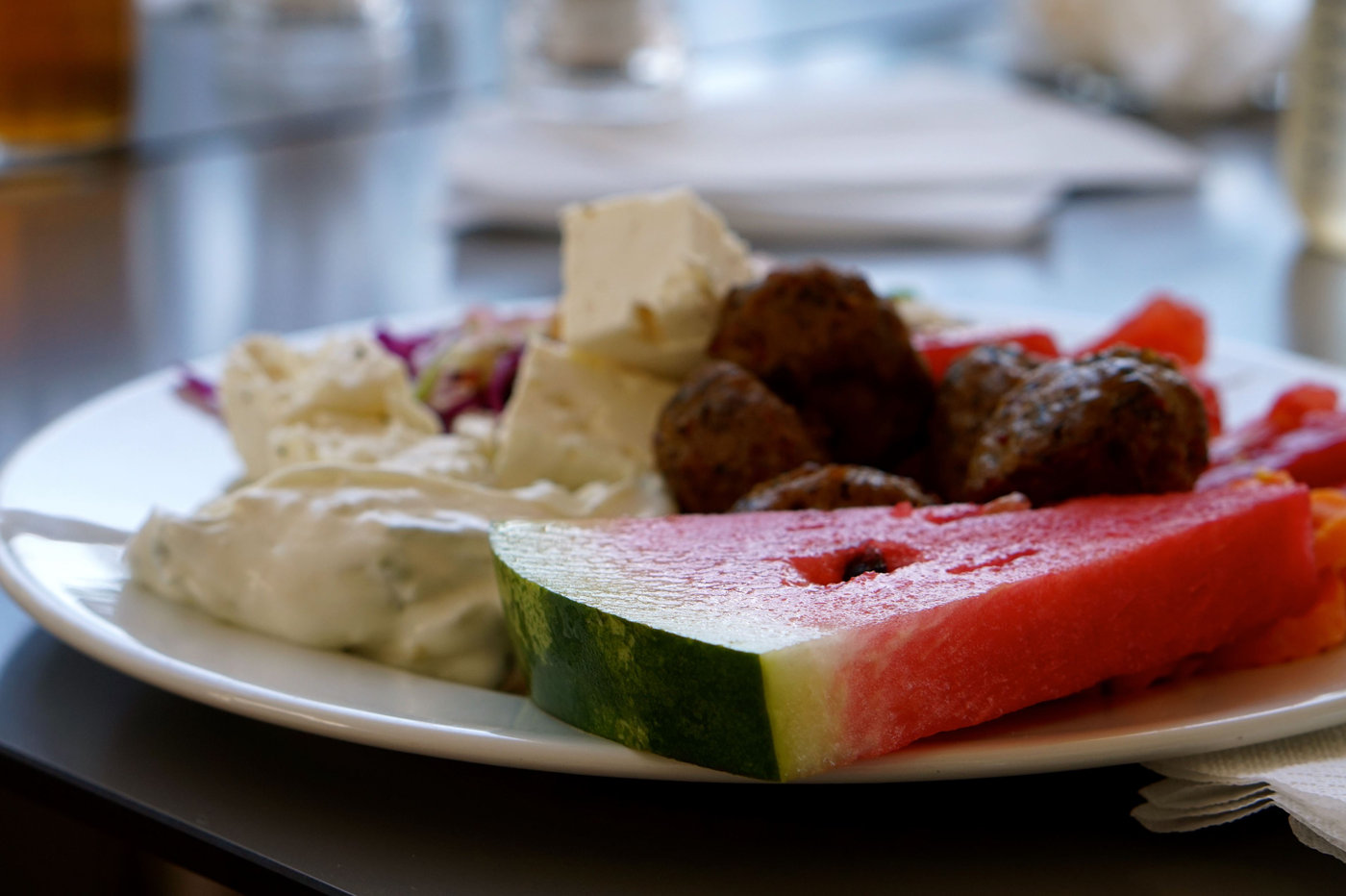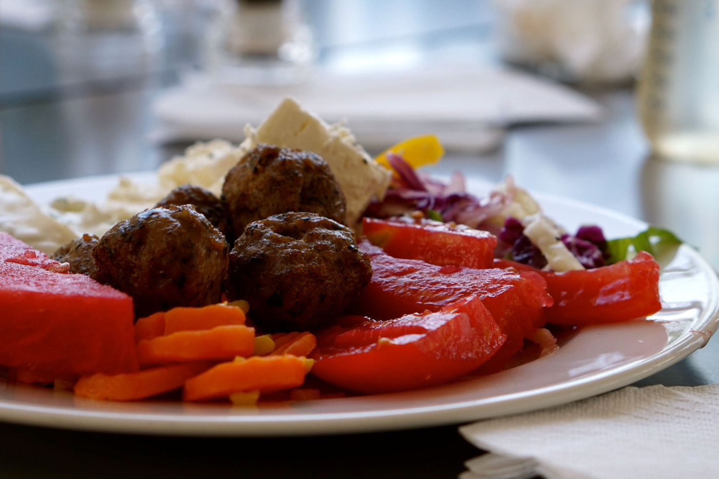 Luncherna blev ofta ett hopplock av lite allt möjligt. Det som alltid fanns på min lunchtallrik var grönsaker, frukt, fetaost, tzatziki och kött i någon form. Den här gången blev det köttbullar, men annars tog jag kyckling eller fisk. Brukade bli en bit bröd till det också. Och ännu mer frukt till efterrätt.