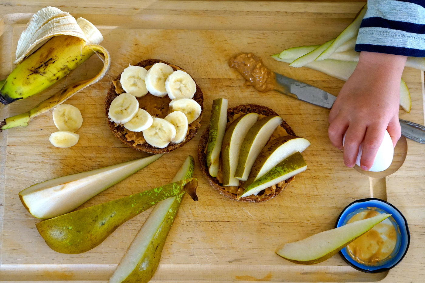 Den här morgonen äter jag smörgås med jordnötssmör och skivor av päron och banan. Till det ett ägg för extra protein och ordentlig mättnad.
