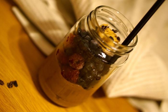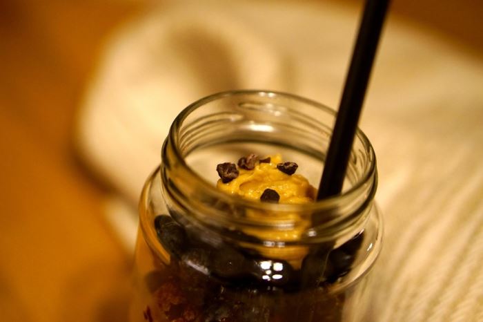 Ljuvlig chokladsmak, sälta från jordnötterna och de fräscha bären ger en härlig smakkombination till mig denna morgon. Men eftersom just den här frukosten lika gärna skulle kunna tas för en efterrätt så kanske jag ska kalla den dessert på burk?