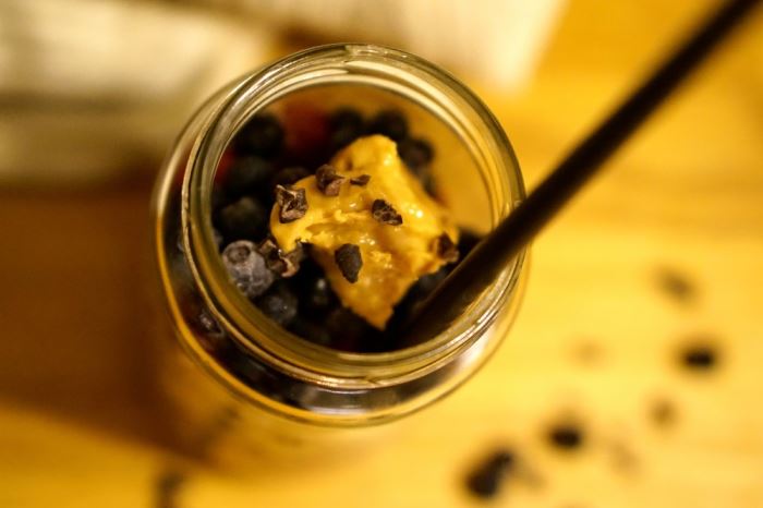 Jag gjorde i ordning den igår kväll och njuter nu av en krämig och len smoothien gjord på choklad, jordnötssmör och banan, toppad med blåbär, hallon, mer jordnötssmör och en nypa kakaonibs.