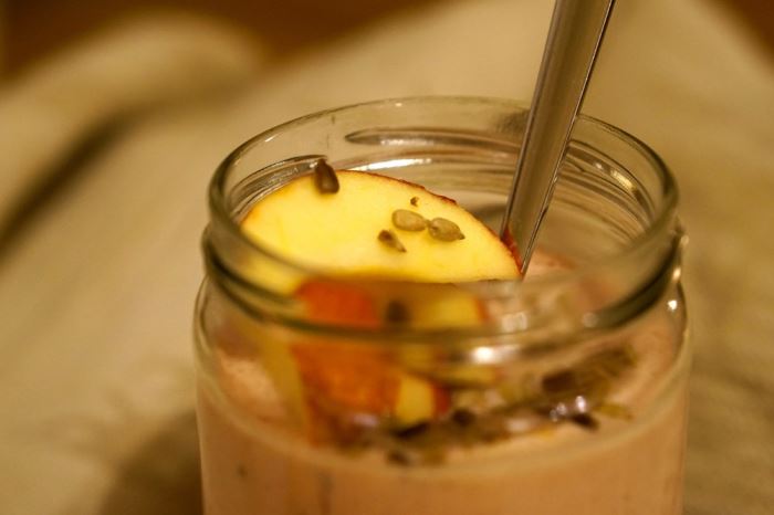 Den här burken fyllde jag med ett lager havregrynsgröt, kryddad med pepparkakskrydda, och sedan ett lager med bärsmoothie. På toppen hade jag äppelklyftor och solrosfrön. Super gott!