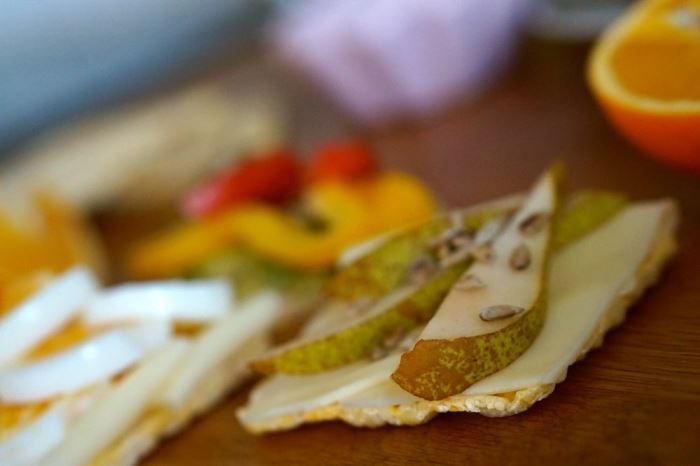 En av majskakorna fick ett lager med smör, ett par skivor med ost och så päronklyftor och några rostade solrosfrön på toppen.