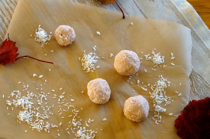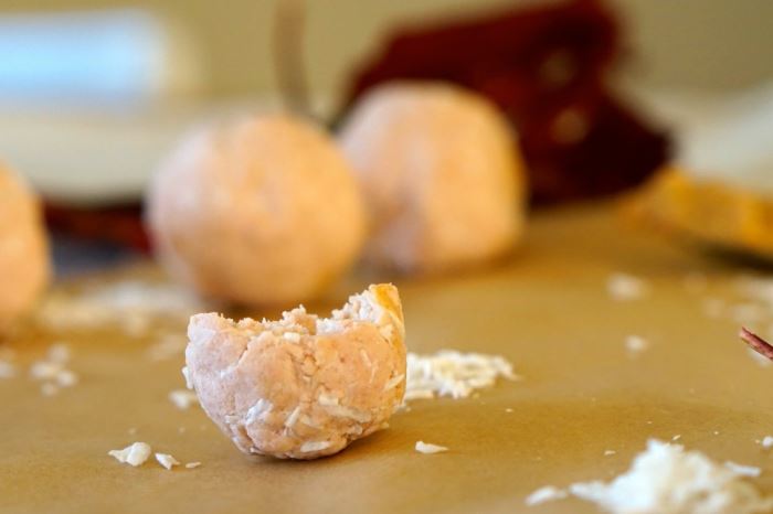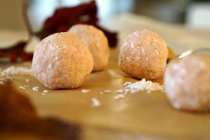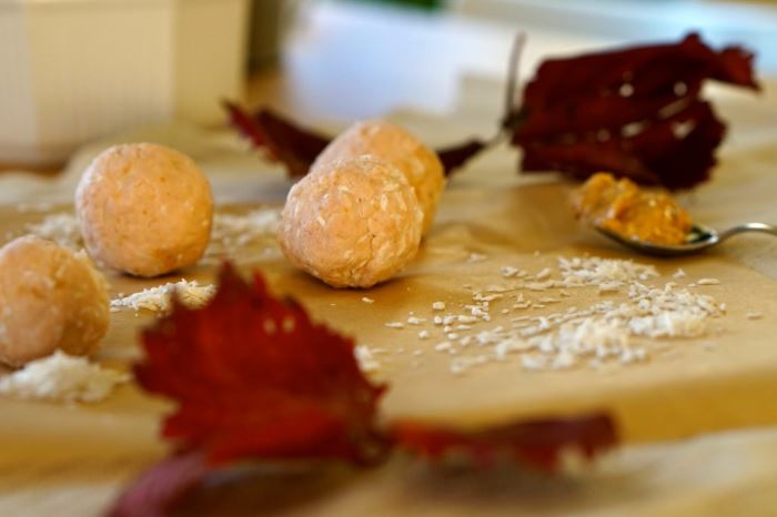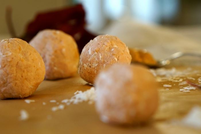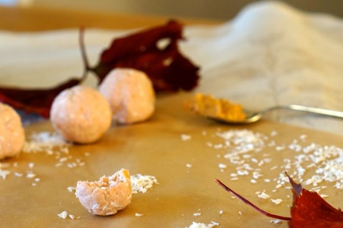 Tillsätt jordnötssmör och kokosflingor. Knåda in dem i massan och forma till fyra bollar. Ställ in i kylen i 1-2 timmar.