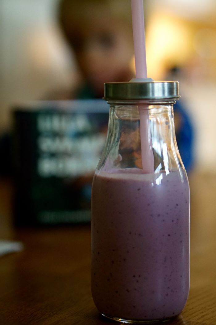 Som alltid när vi har plockat bär i skogen ville Wilmer göra smoothie när vi kom hem igen. Det blev en krämig variant av blåbär, lingon, banan och mango. Mycket god, tyckte båda barnen. Och den där svampboken får vi nog läsa mer i så att vi nästa gång kan hitta några trattkantareller.