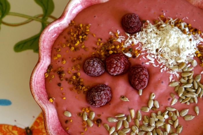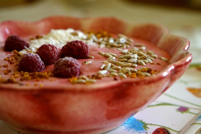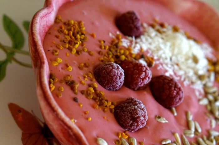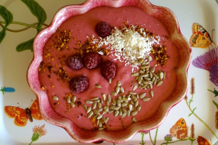 När man häller upp en smoothie i en skål istället för i burk eller glas öppnas möjligheterna för topping upp på ett helt annat sätt. Visst kan man även toppa den drickbara smoothien med mycket gott också. Men det blir inte lika enkelt att få i sig den då. En smoothie bowl går att garnera med massor av gott och är samtidigt enkel att äta med sked. Här kommer min smoothie bowl från dagens frukost!