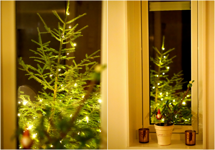 Det blåste rejält utomhus igår kväll när jag tog de här bilderna. Vår lilla gran på farstukvisten höll på att blåsa omkull. Men ganska mysigt att vara inomhus när vinden viner ute.