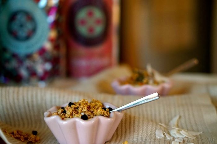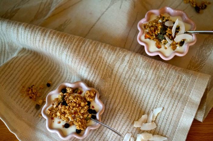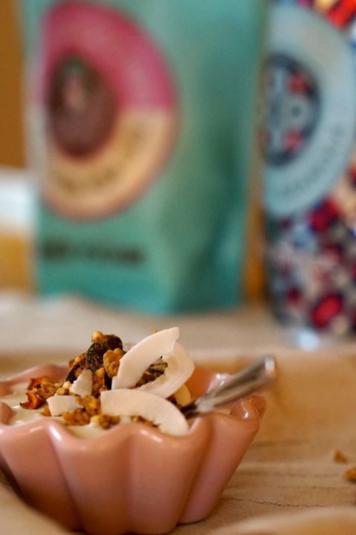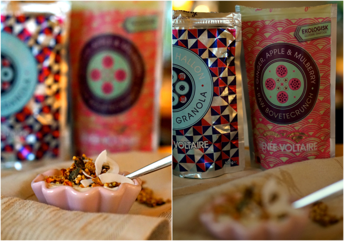 Renée Voltaires granola i olika slags smaker är så god och jag hade två att välja på. Fast jag kunde inte välja så jag fyllde två små skålar med kvarg och fil samt strösslade över granola. Den ena fick granola med smak av blåbär och hallon, den andra fick granola med smak av äpple, ingefära och mullbär. Jag toppade även de båda skålarna med rostade kokosflarn. Mums!