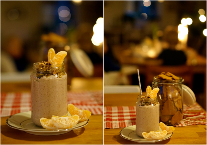 Pepparkakssmoothie med granola. Den med smak av ingefära, äpple och mullbär passade bra. Och så några klyftor clementin. Det är höjden av frukost i juletid det!