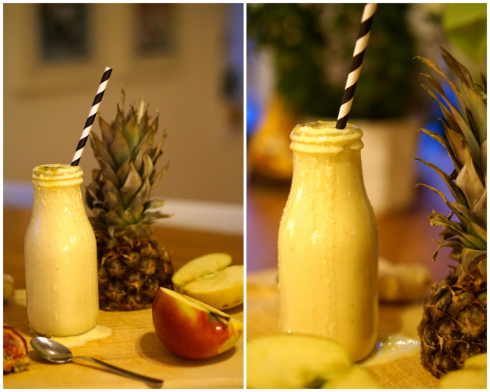 Vi drack denna ananassmoothie medan vi knaprade på äppelklyftor och ananasbitar. Ett exotiskt, läskande, gott och nyttigt mellanmål!