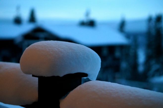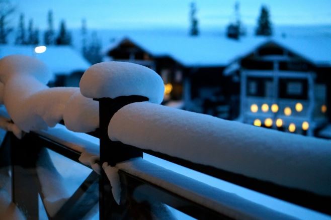 Snön ligger djup på vår balkong och det känns inte riktigt som läge för att sitta där och fika. Men att stå där en stund och blicka ut över omgivningen är fint.