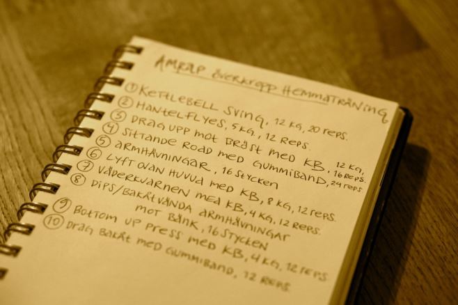 Härom dagen hittade jag ett träningspass i min kalender för 2015. Det var ett träningspass för överkroppen som jag senast gjorde i början av förra året. Tio övningar där jag hade gett instruktioner om både vikter och antal repetitioner. Några av dem bytte jag ut när jag tränade ett hemmapass i morse och det var för att jag valde att bara använda kettlebells som träningsredskap den här gången. Jag kallar det här passet för Hemmaträning AMRAP.