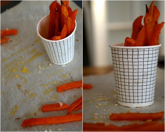 Häll av vattnet i ett durkslag så att sötpotatisen blir av med allt vatten. Lägg bakplåtspapper på en plåt och lägg sötpotatisen där. Ringla över olja och strö över flingsalt. Bred ut stavarna på bakplåtspappret. Ställ in i ugnen på 200 grader och låt dem rostas där i ca 30 minuter.