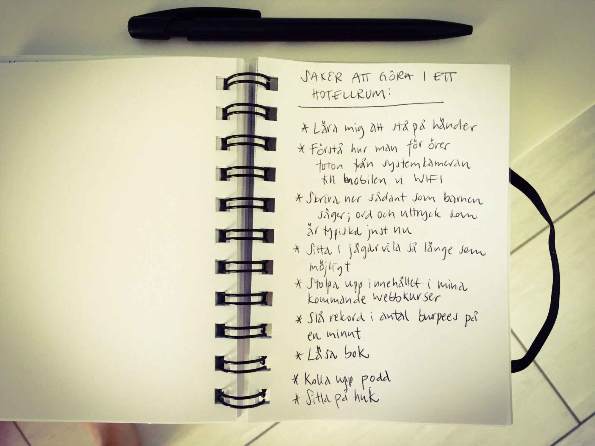 Efter att mannen och Smilla hade åkt igår morse och innan Wilmer vaknade satt jag på balkongen och grät en skvätt. Det kändes så ofantligt tråkigt att vår gemensamma semester hade slutat så här och jag fruktade att en hel vecka instängd i ett hotellrum skulle kunna bli segt. När jag är ledsen fungerar jag ofta så att jag gör något handlingskraftigt ganska direkt, istället för att sitta och deppa. Så jag tog fram penna och papper och skrev en lista på sådant som jag skulle kunna syssla med på hotellrummet medan Wilmer sov eller kollade på film.