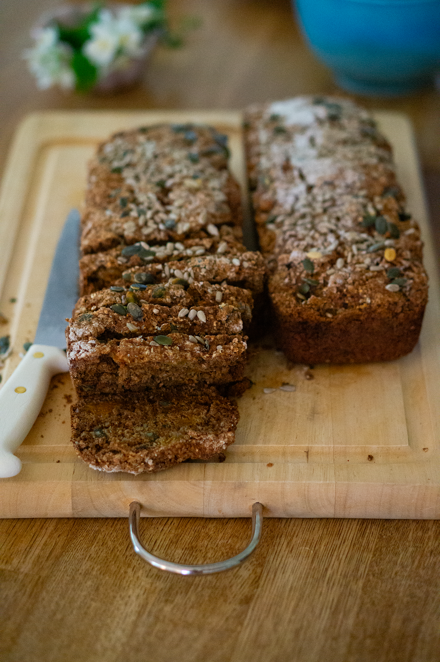 Smörj en brödform med smör alternativt klä den med bakplåtspapper och häll i smeten. Toppa brödlimporna med pumpakärnor och solrosfrön.