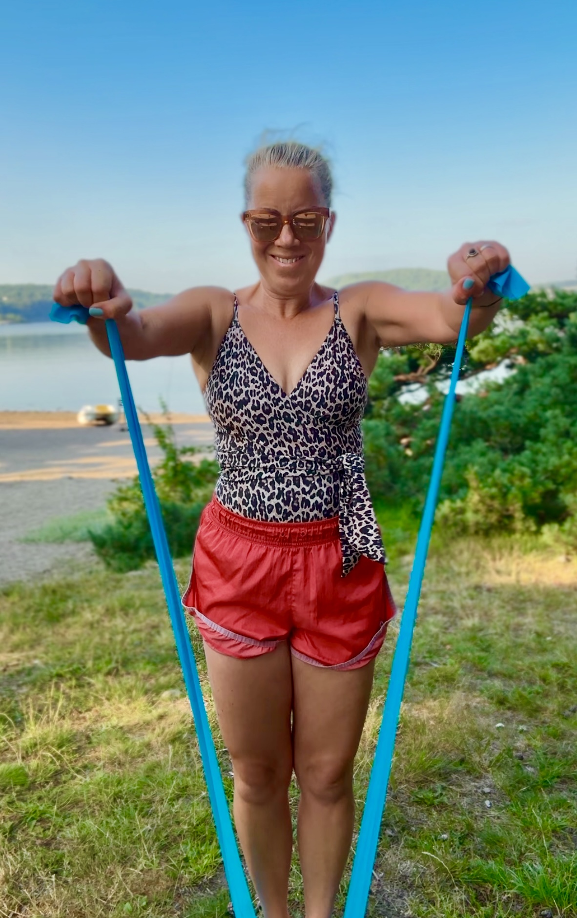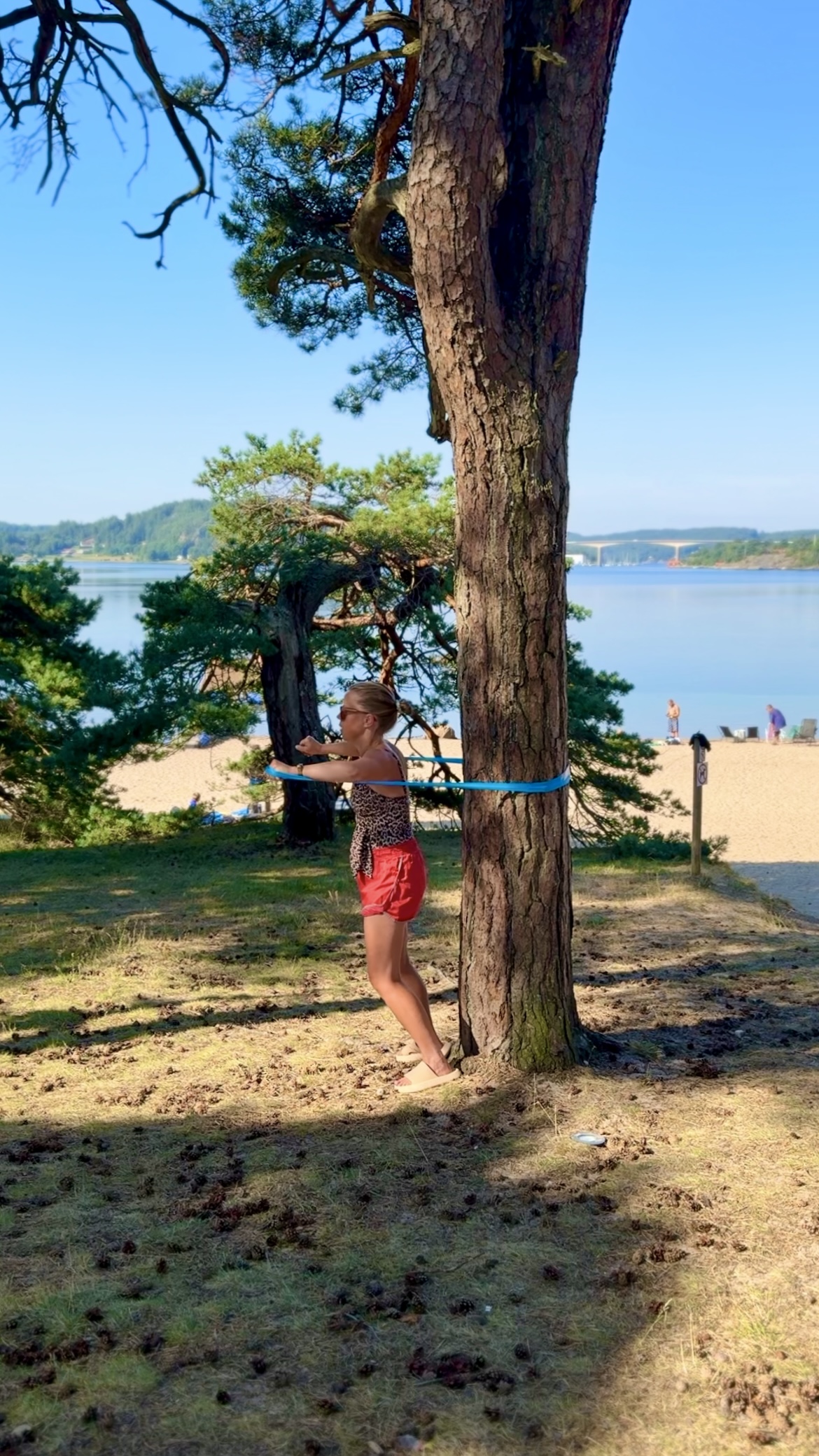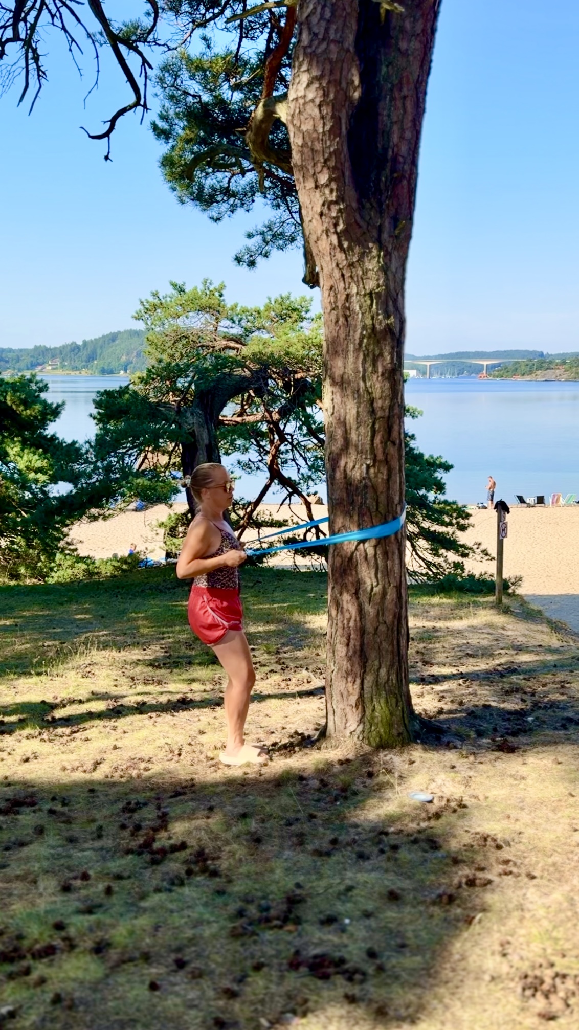 Här får du detta enkla men effektiva pass, som jag körde på stranden, och som stärker axlar, armar, bröst och rygg. Du behöver bara ett gummiband och en trädstam, stolpe eller dylikt att fästa gummibandet mot.