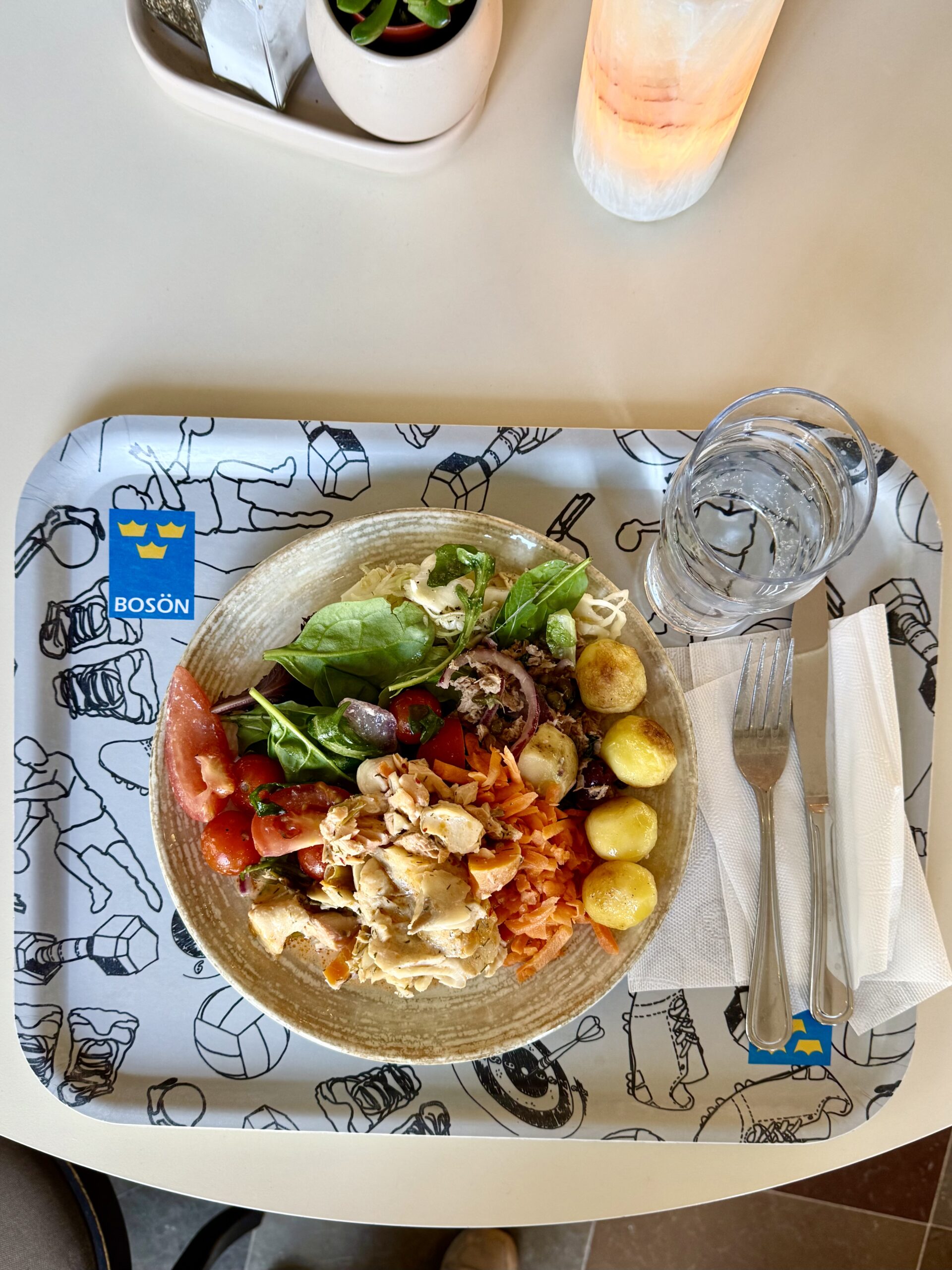 Vi fick njuta av både en magisk god 3-rätters middag, en schysst frukost och en välsmakande lunch när vi var där. Här ser du den lunch jag åt, bestående av en fiskgryta, potatis och mycket gott från salladsbuffén.