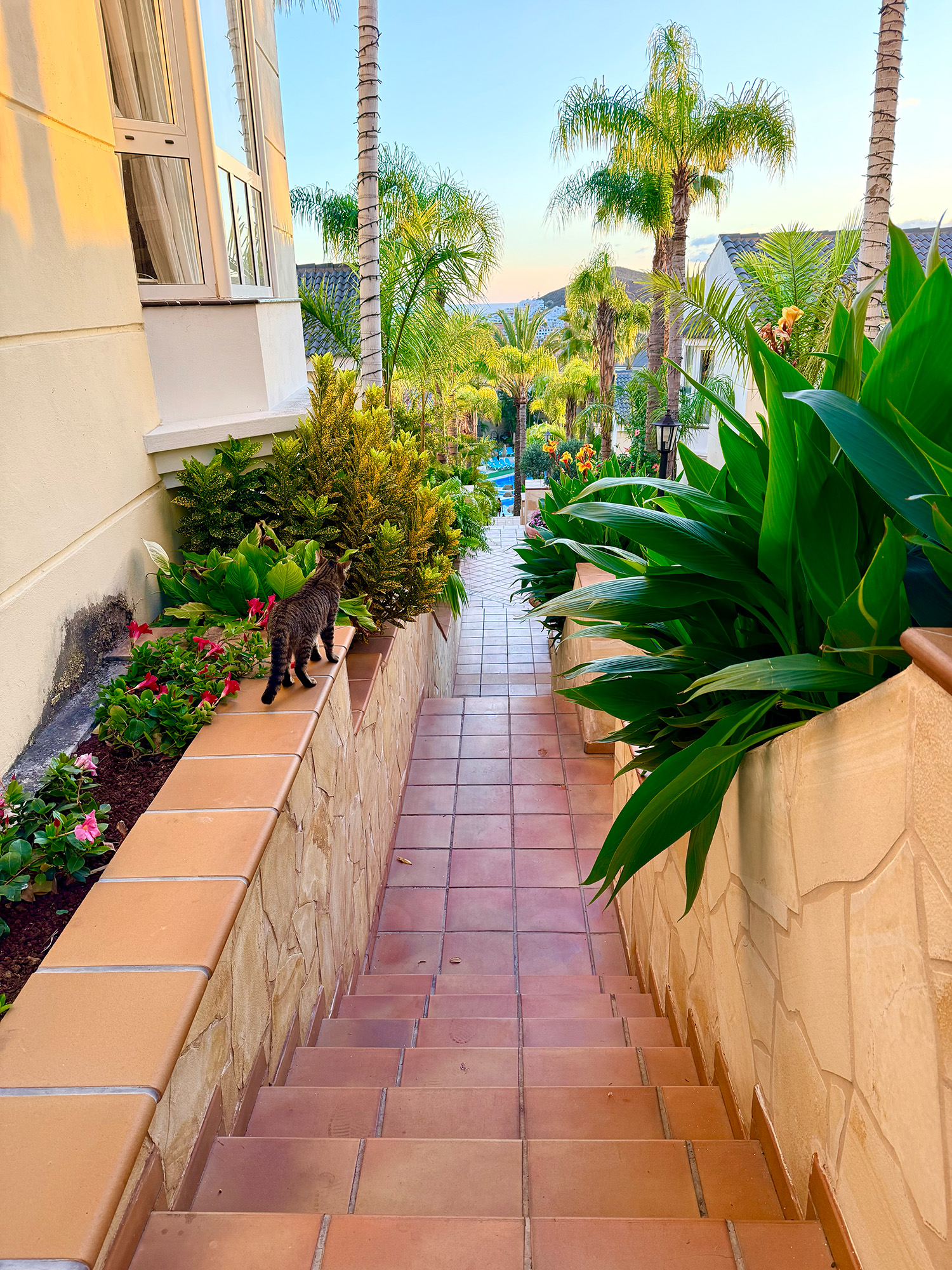 Jag njöt särskilt av de vackra blommorna, som kan växa där i värmen. Området är ganska backigt och har många trappor. Vi hade vår lägenhet högst upp på området och hade därmed en fin utsikt över det.