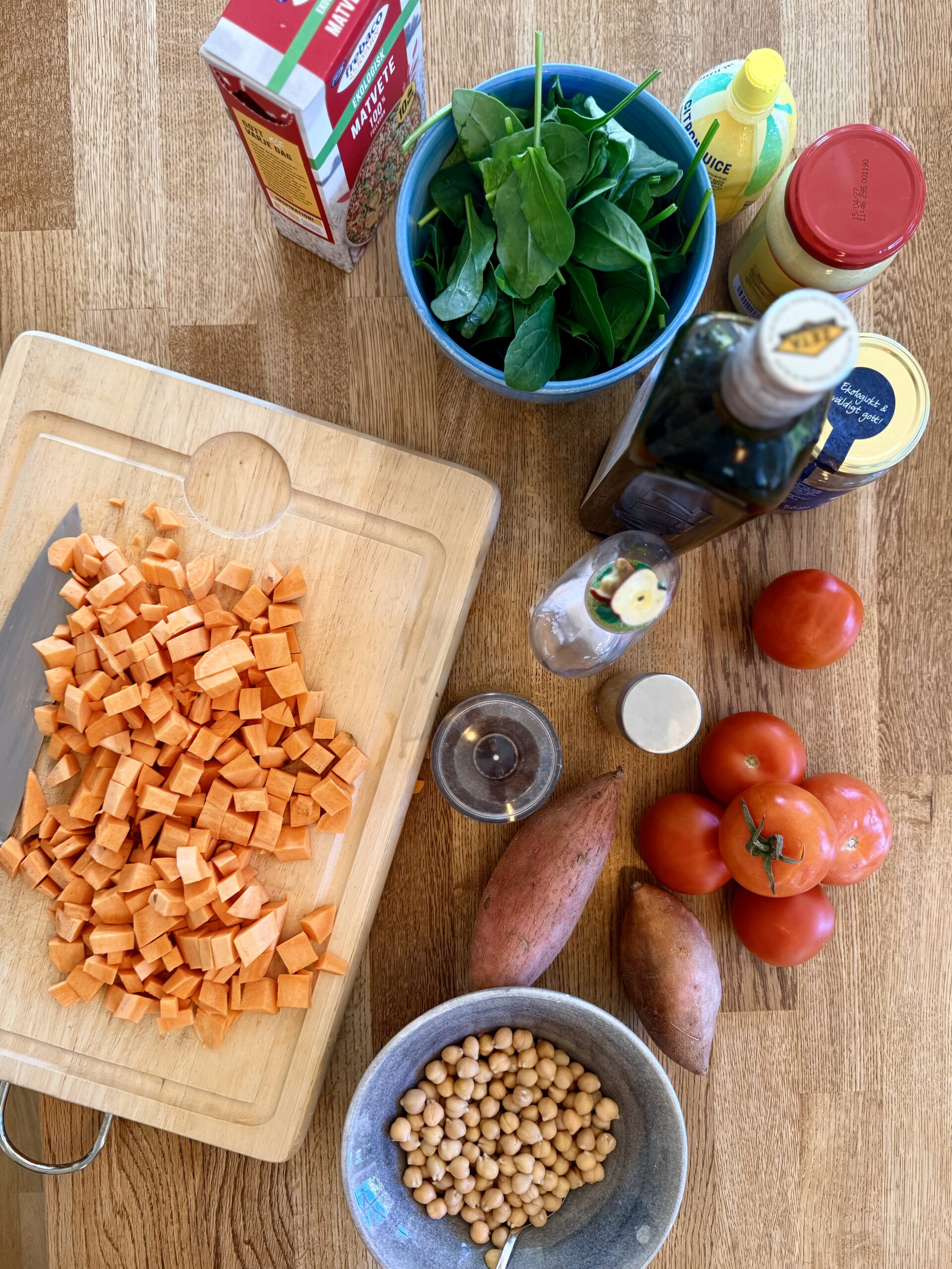 Skala och skär sötpotatisarna i kuber på ca 2 cm. Häll av och skölj kikärtorna samt torka dem torra. Lägg sötpotatis och kikärtor på en bakpappersklädd plåt och blanda med olja, spiskummin, salt och peppar. Rosta i mitten av ugnen i ca 20 minuter eller tills sötpotatis och kikärtor har får lite färg.