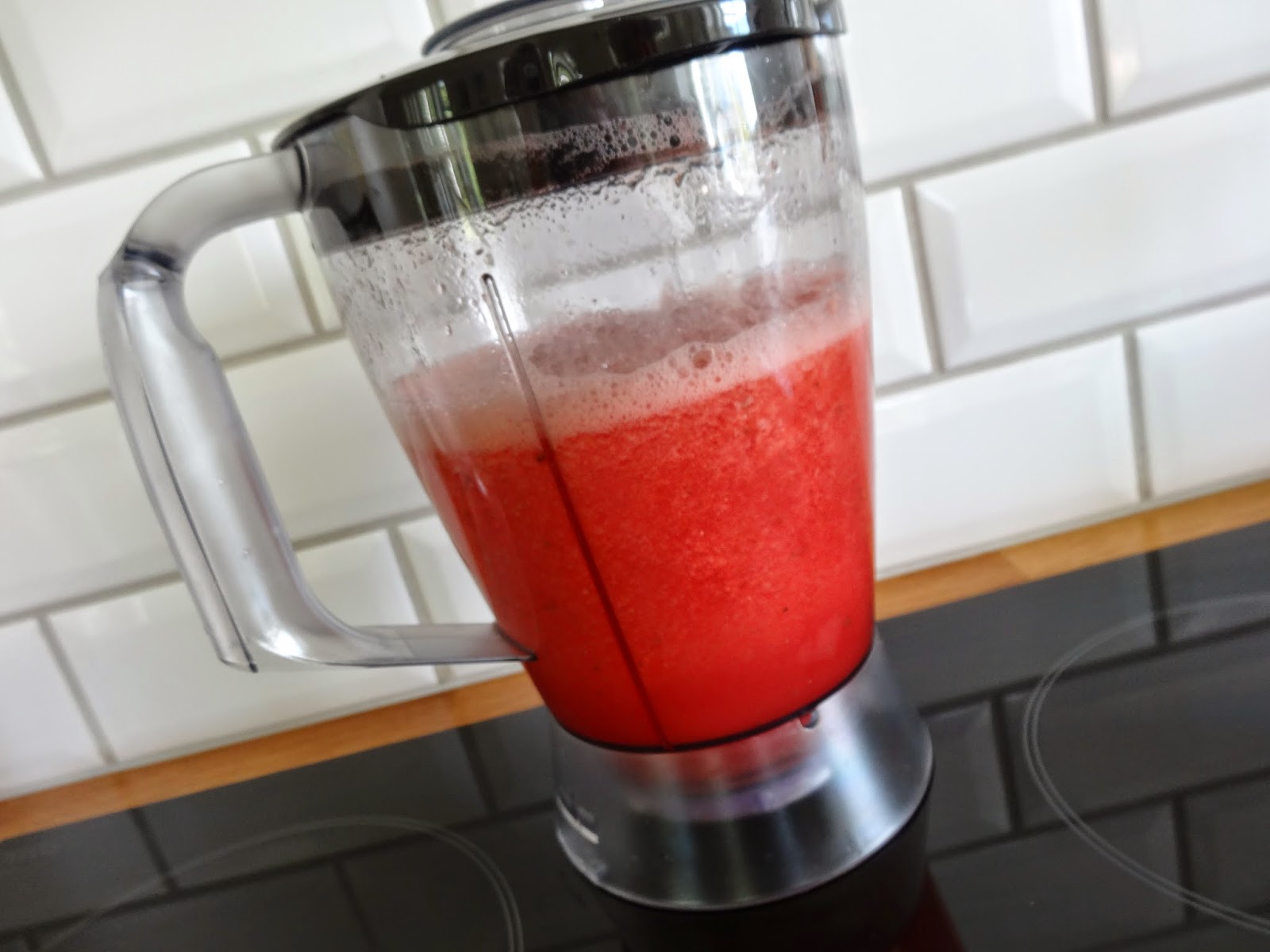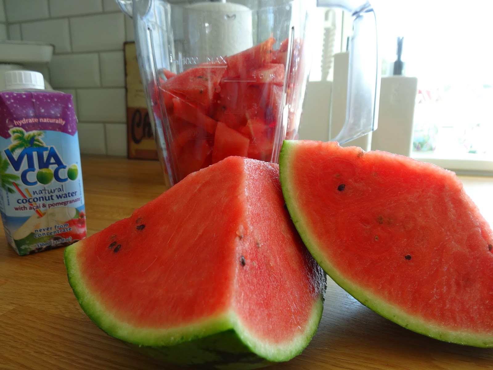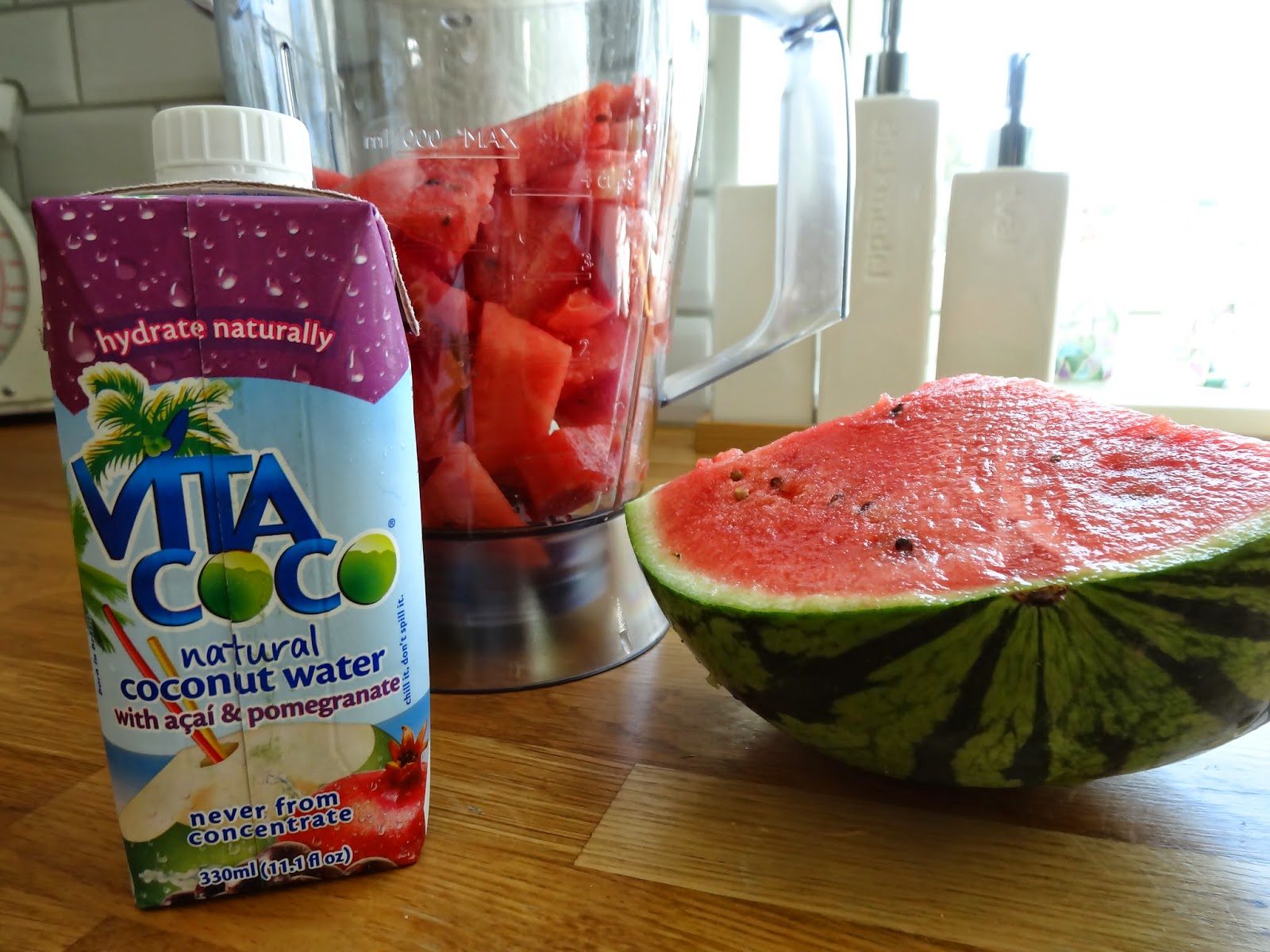 I med ett gäng bitar vattenmelon i mixern och späd med lite vätska, som kokosvatten till exempel. Mixa och häll upp i glas.